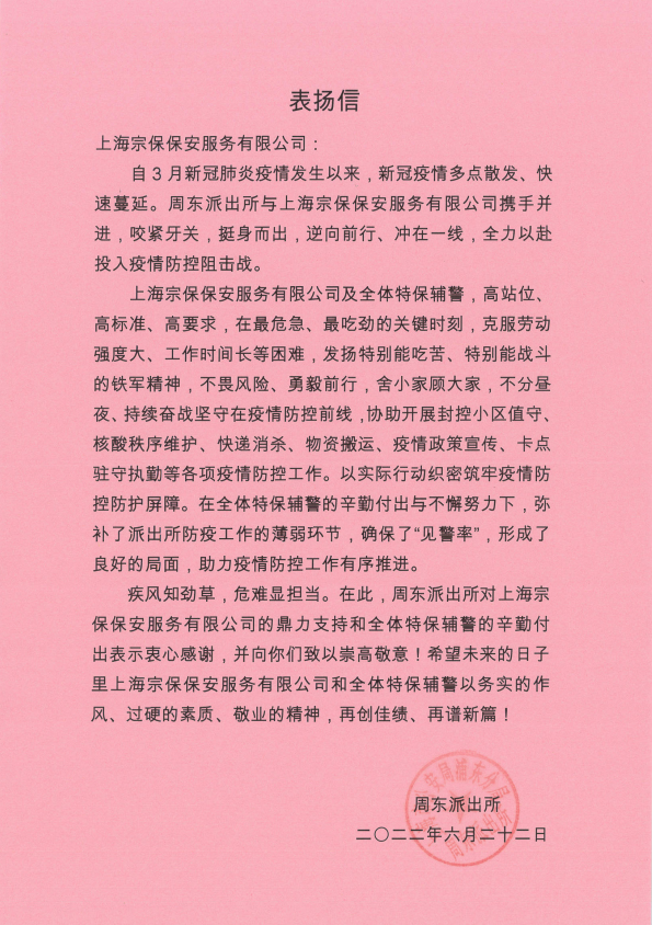 6月28日,宗保公司收到浦東公安分局周東派出所的表揚(yáng)信,表揚(yáng)疫情防控期間宗保公司全力支持和配合派出所開展疫情防控所做的工作。