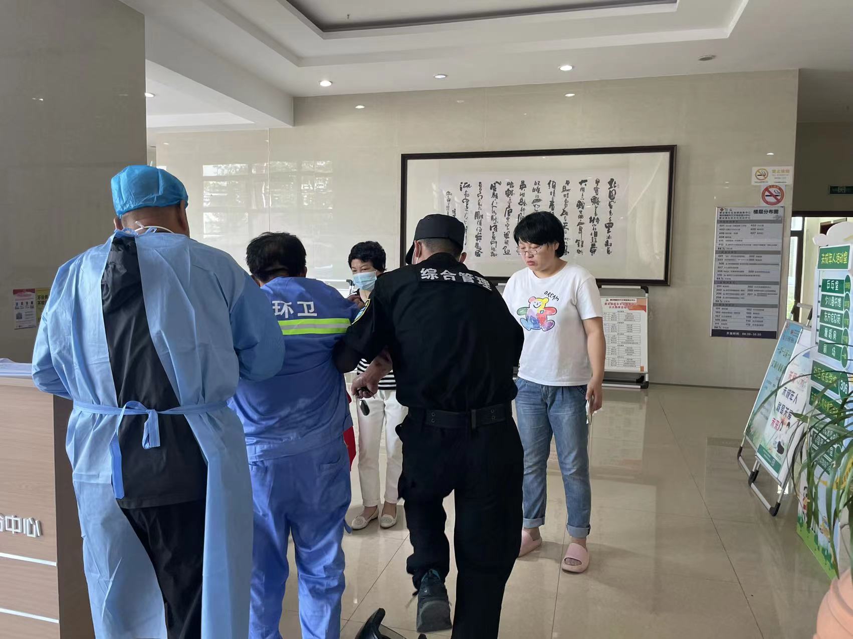 7月12日8:30,公司駐崇明區(qū)建設(shè)鎮(zhèn)項目員工韓永坤在建設(shè)鎮(zhèn)文化活動中心核酸采樣點保障時,發(fā)現(xiàn)一位身穿藍(lán)色環(huán)衛(wèi)衣的老人癱坐在地,臉色蒼白,衣服濕透,疑似中暑。韓永坤攙扶老人,遞服仁丹和礦泉水,并聯(lián)系其家人送往醫(yī)院治療。