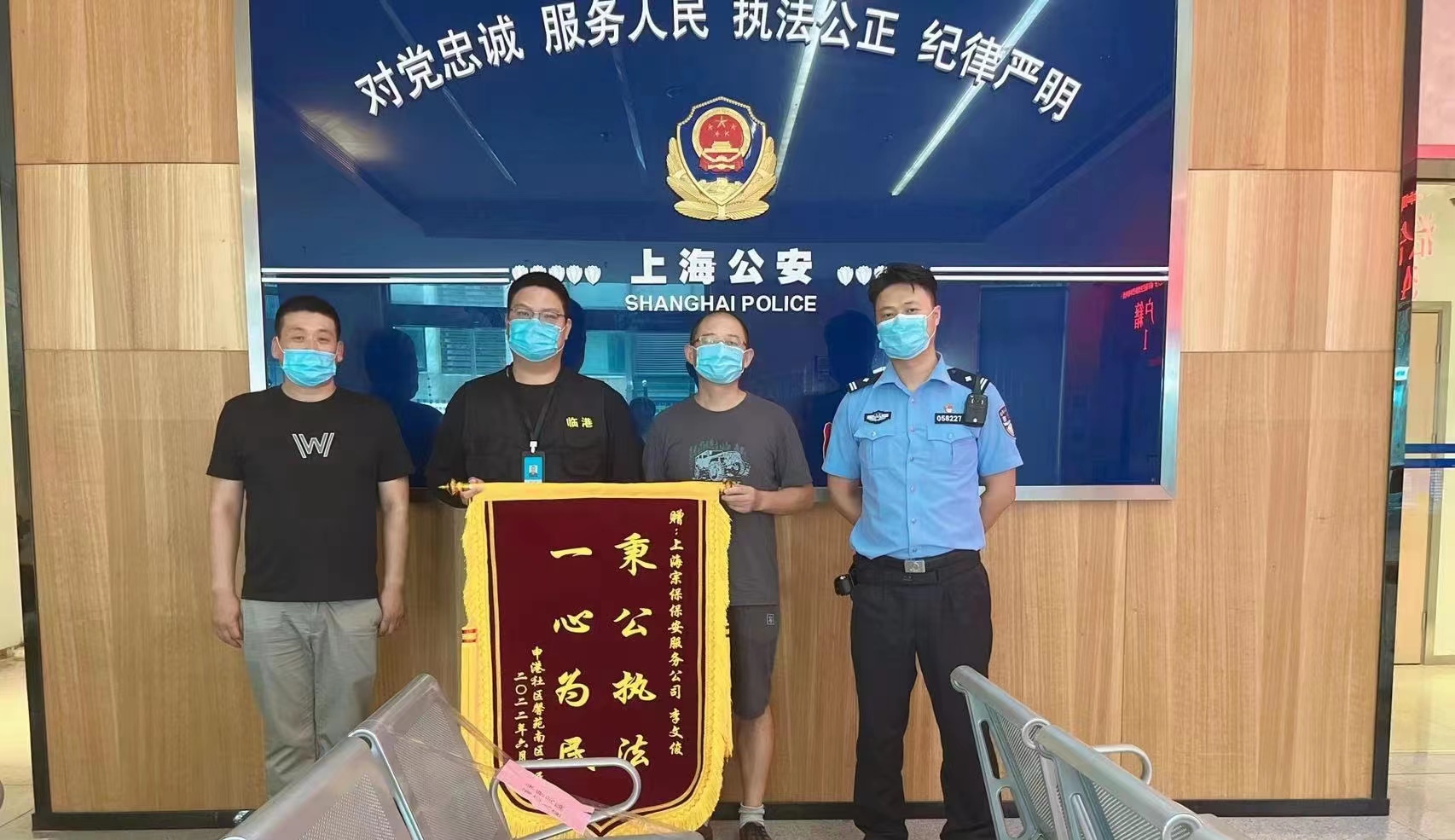 7月8日,宗保公司駐臨港新城輔警項目隊員李文俊收到中港社區(qū)馨苑南區(qū)居民贈送的一面繡有“秉公執(zhí)法 一心為民”的錦旗,贊揚他克制忍讓的行為。