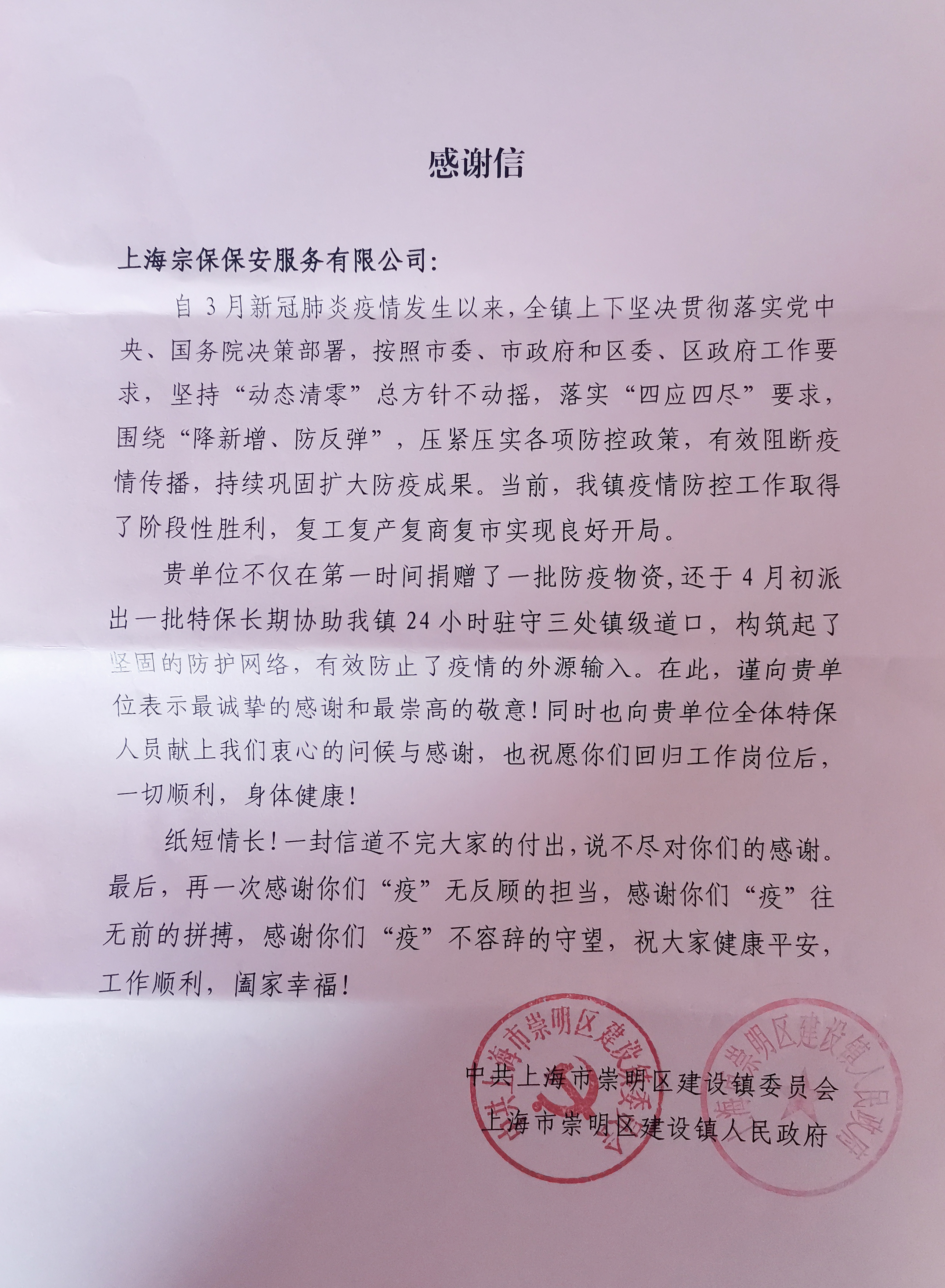 6月30日,中共上海市崇明區(qū)建設(shè)鎮(zhèn)委員會和崇明區(qū)建設(shè)鎮(zhèn)人民政府送來感謝信,對宗保公司全力協(xié)助建設(shè)鎮(zhèn)開展疫情防控工作表示感謝。