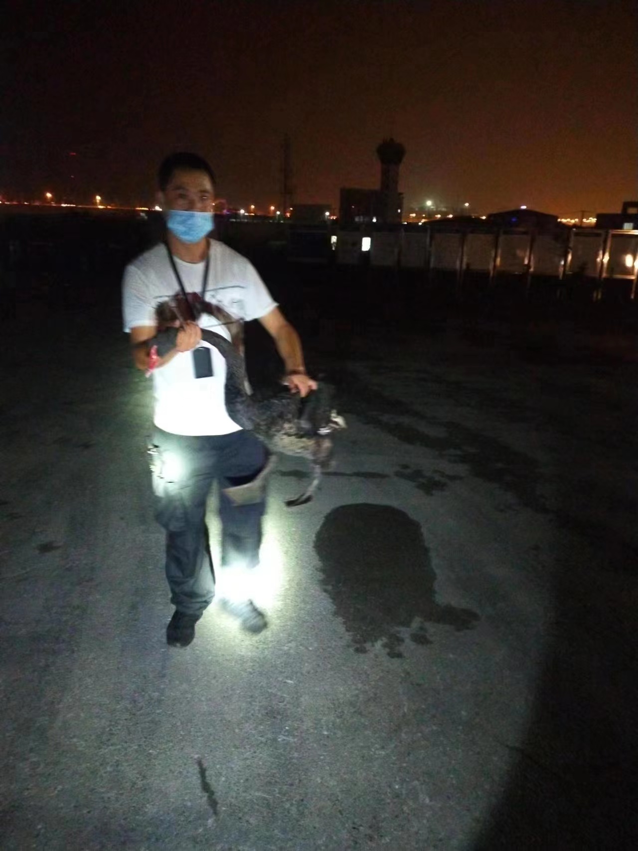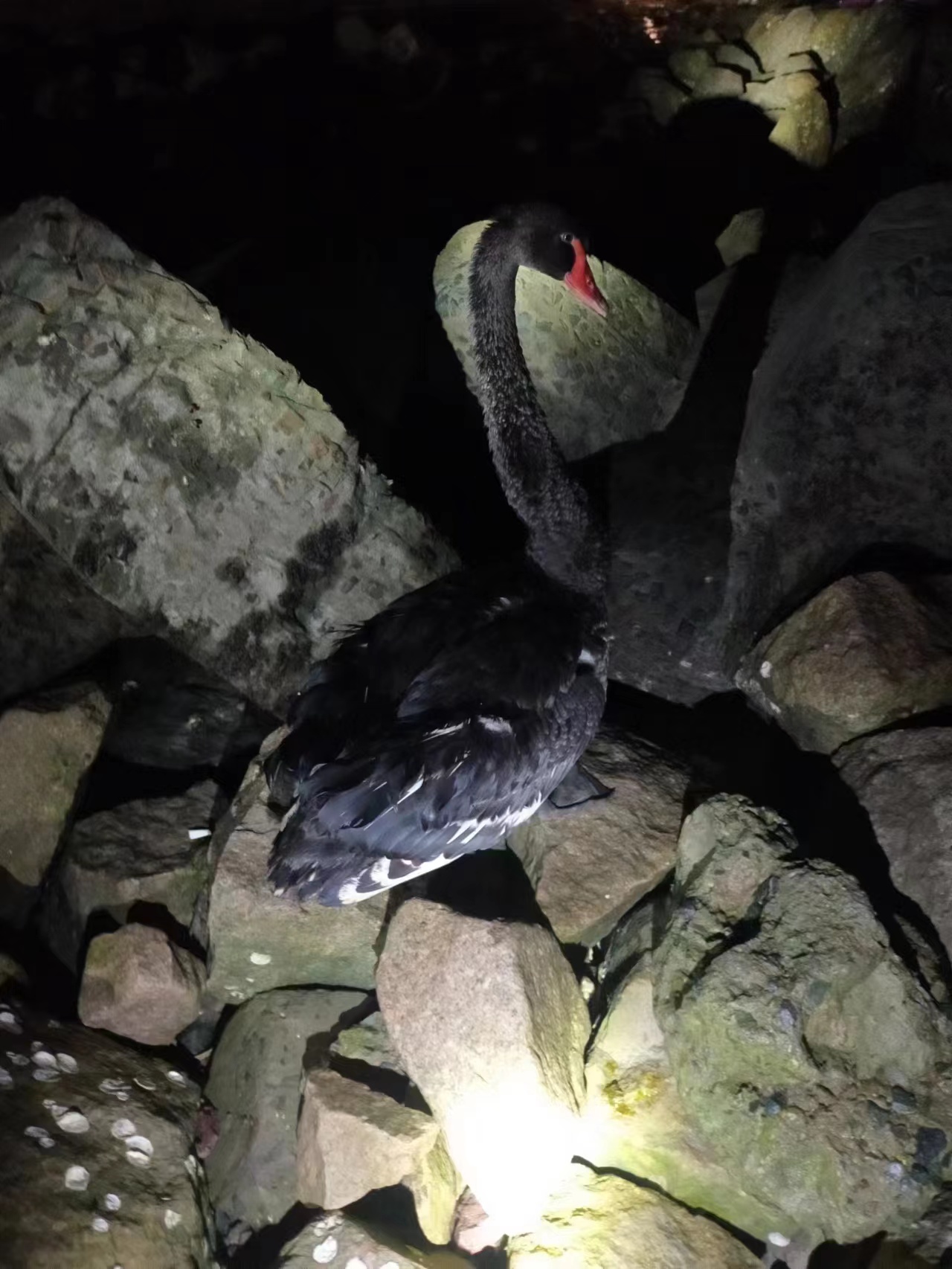 當(dāng)天23:00,李漢濤和姜永輝在海堤巡查時(shí),發(fā)現(xiàn)一只受傷的黑天鵝。當(dāng)時(shí),這只大鳥精神不振,渾身顫抖,體力似乎不支,已經(jīng)無法自行飛起。兩人迅即將情況上報(bào)給派出所值班民警,并按指示將黑天鵝帶回派出所做進(jìn)一步處理。