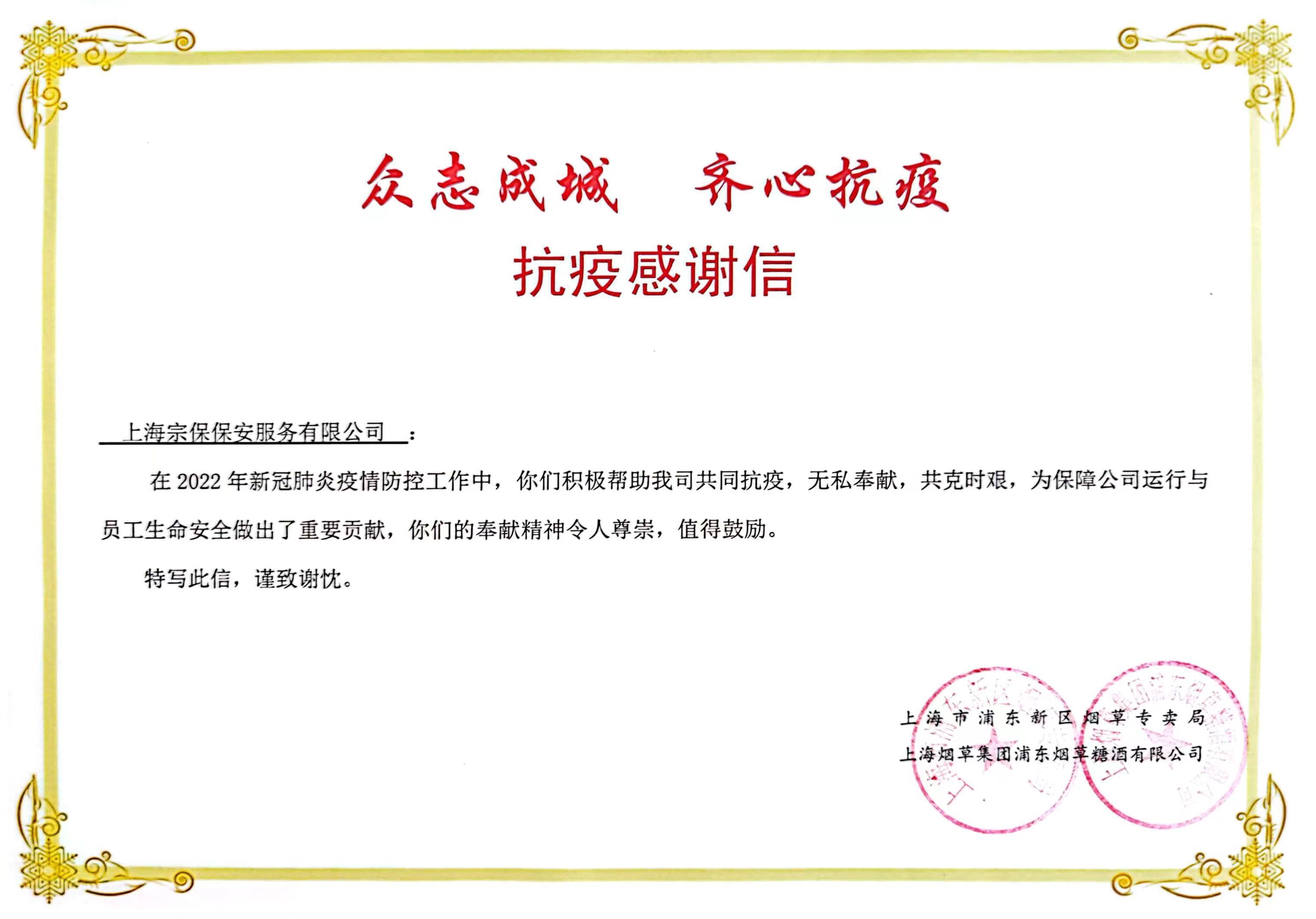 8月16日,宗保公司收到上海市浦東新區(qū)煙草專賣局和上海煙草集團(tuán)浦東煙草糖酒有限公司的感謝信,信中對(duì)公司在疫情防控期間所做的工作表示衷心的感謝。