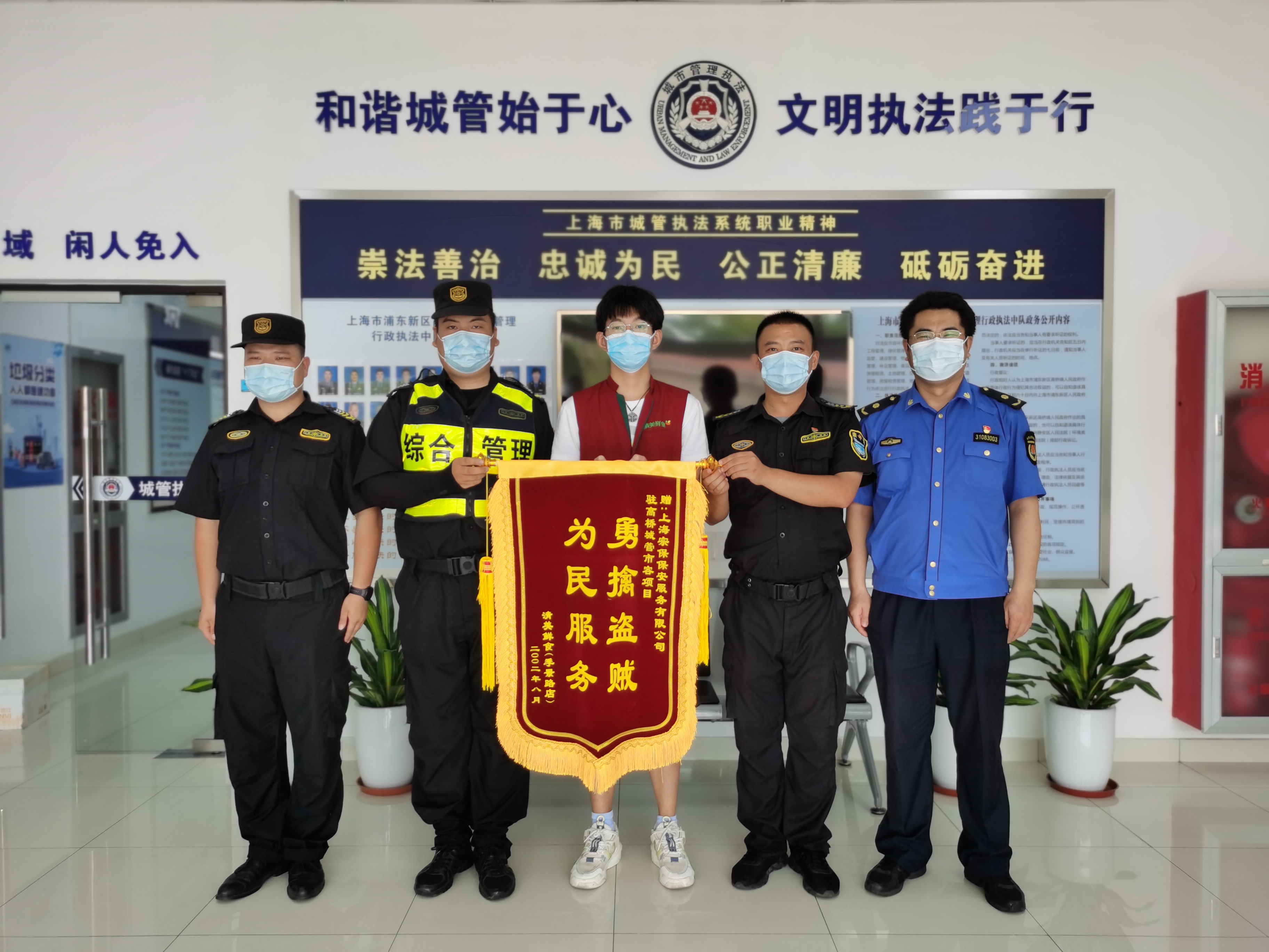 8月25日,宗保公司駐高橋市容項目收到清美鮮食店送來的一面繡有“勇擒盜賊 為民服務(wù)”的錦旗,感謝宗保員工郝鑫鑫和王培陽幫助擒竊賊的行為。