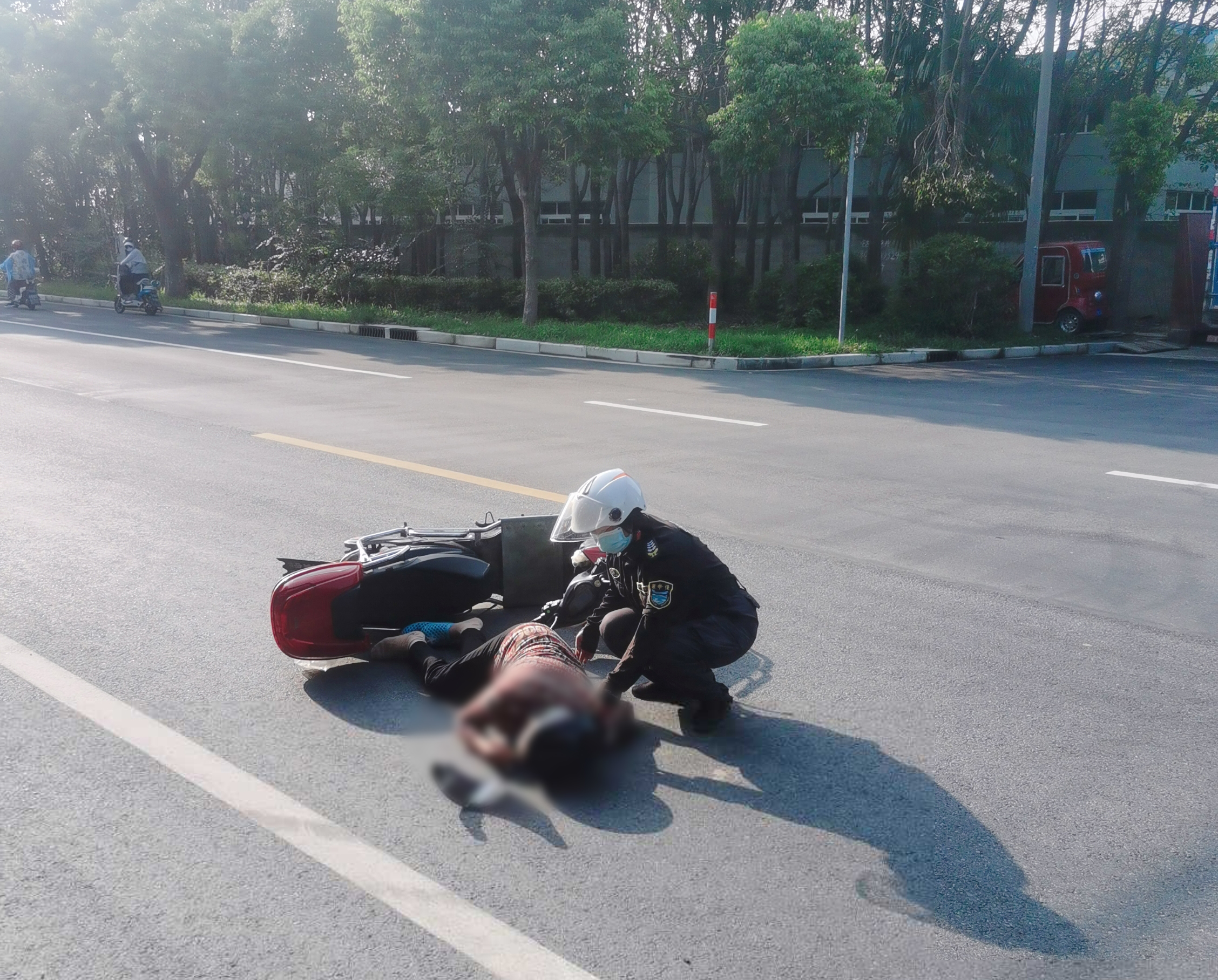 當(dāng)日16:01,龍鳳嬌在科工路附近巡邏時,看到一位老人躺在馬路中間,一輛電瓶車倒在一旁,就趕緊上前察看。