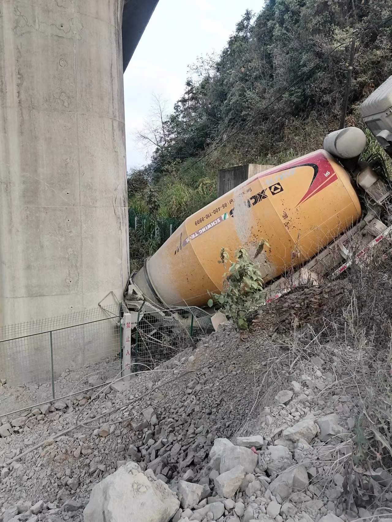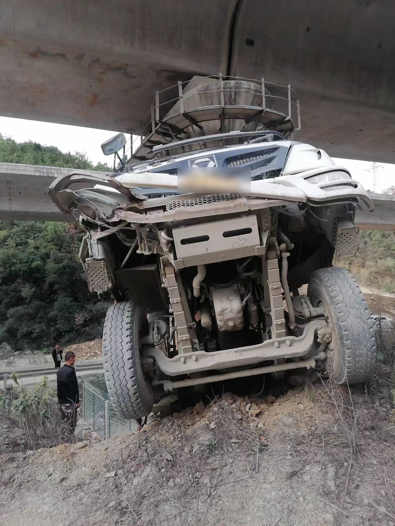 當(dāng)日16:52,公司員工吳敏紅在杭黃高鐵外塢特大橋K123+161處巡邏時(shí),發(fā)現(xiàn)一輛水泥罐車從20號(hào)橋墩處掉下,撞擊并卡在橋墩上動(dòng)彈不得,嚴(yán)重威脅著高鐵線路的行車安全。