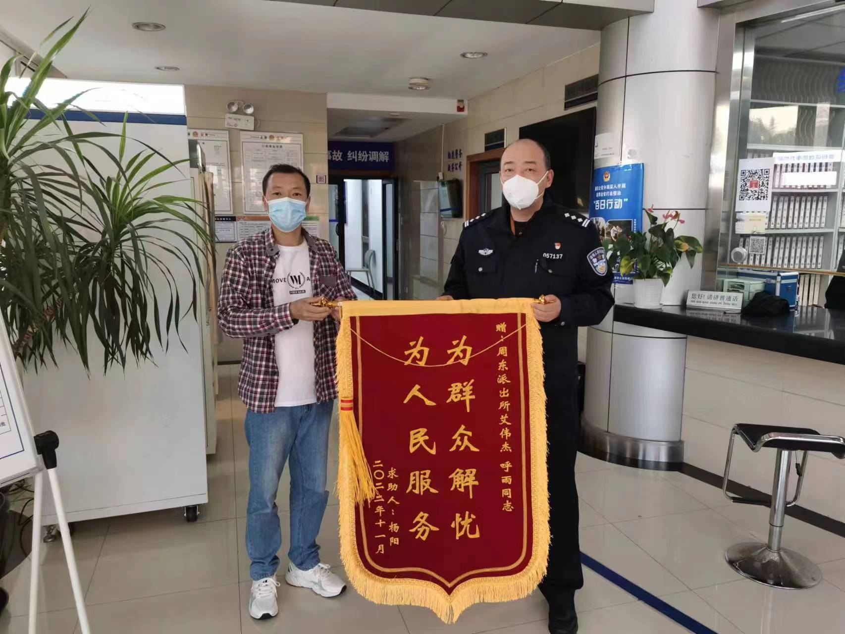 11月12日,浦東公安分局周東派出所收到市民楊先生送來的一面繡有“為群眾解憂 為人民服務(wù)”的錦旗,感謝宗保公司駐派出所項目員工幫尋寵物狗狗主人的熱心行為。