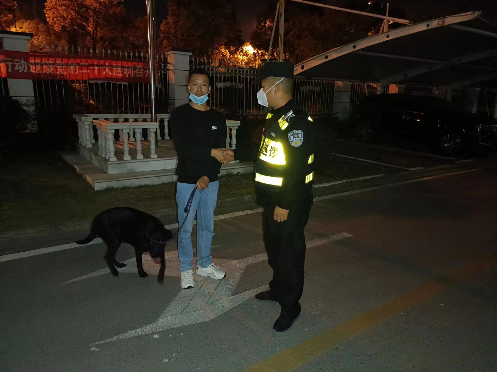 11月7日,一男子向派出所打來求助電話,稱自家寵物狗跑丟了,想查看小區(qū)附近監(jiān)控視頻。經(jīng)過了解,發(fā)現(xiàn)男子想要尋找的寵物狗,正是艾偉杰和呼雨在路邊撿到的拉布拉多。當(dāng)天19:50,男子趕到派出所領(lǐng)回了自己的愛犬。事后,拉布拉多犬的主人楊先生特意送來一面錦旗以示感謝。