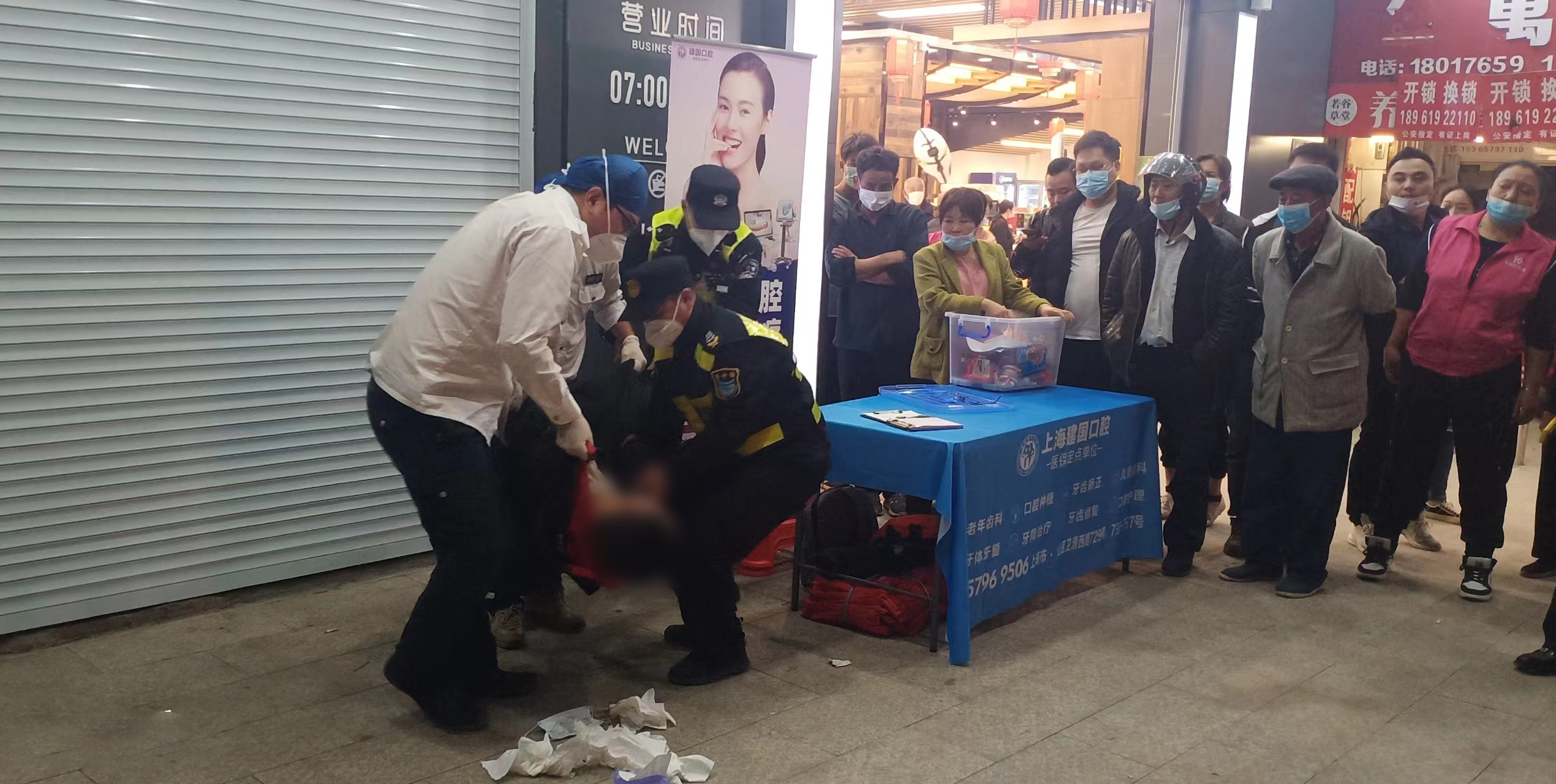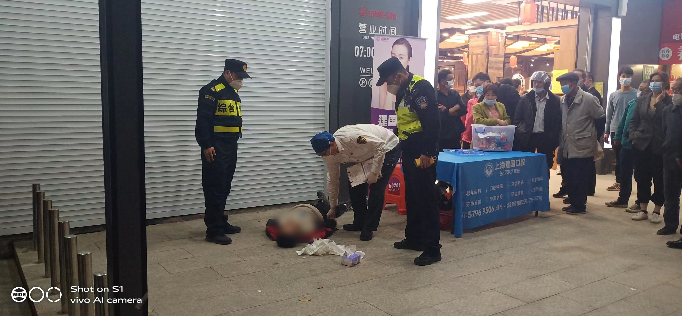 當(dāng)日17:00,宗保員工王剛和劉躍春巡查至金山區(qū)龍皓路綠地東尚超市門口時,看到一個男子躺在地上,便趕緊上前察看。