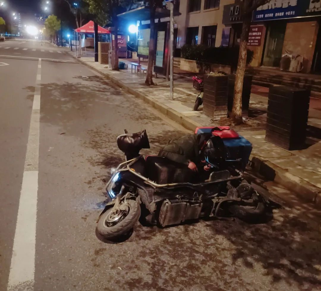 當(dāng)日凌晨2:30,公司員工李漢濤、李文明和劉潤(rùn)在方竹路789弄小區(qū)附近巡邏時(shí),看到一男子趴在一輛倒地的電瓶車(chē)上,就趕緊上前察看。