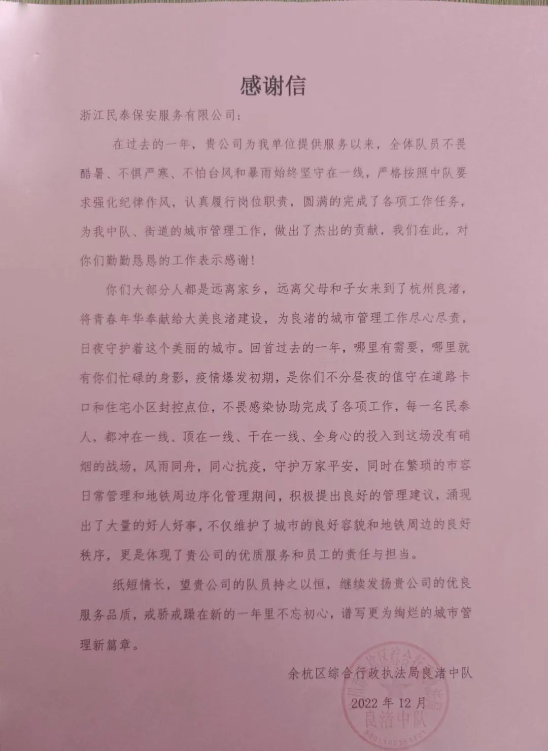 12月16日,浙江民泰保安公司收到杭州市余杭區(qū)綜合行政執(zhí)法局良渚中隊的感謝信,信中充分肯定了公司員工履職盡責的出色表現。