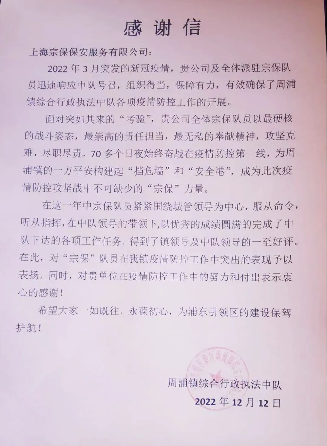 12月12日,宗保公司收到浦東周浦鎮(zhèn)綜合行政執(zhí)法中隊(duì)的感謝信,信中對(duì)宗保公司全力支持配合執(zhí)法中隊(duì)開展疫情防控工作表示感謝。