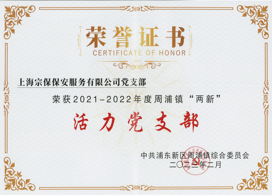 2月15日,浦東新區(qū)周浦鎮(zhèn)黨委對一批優(yōu)秀強國學(xué)習(xí)達人、優(yōu)秀黨務(wù)能手和先進基層黨組織進行表彰。上海宗保保安服務(wù)有限公司黨支部榮獲2021-2022年度周浦鎮(zhèn)“兩新”活力黨支部榮譽稱號。