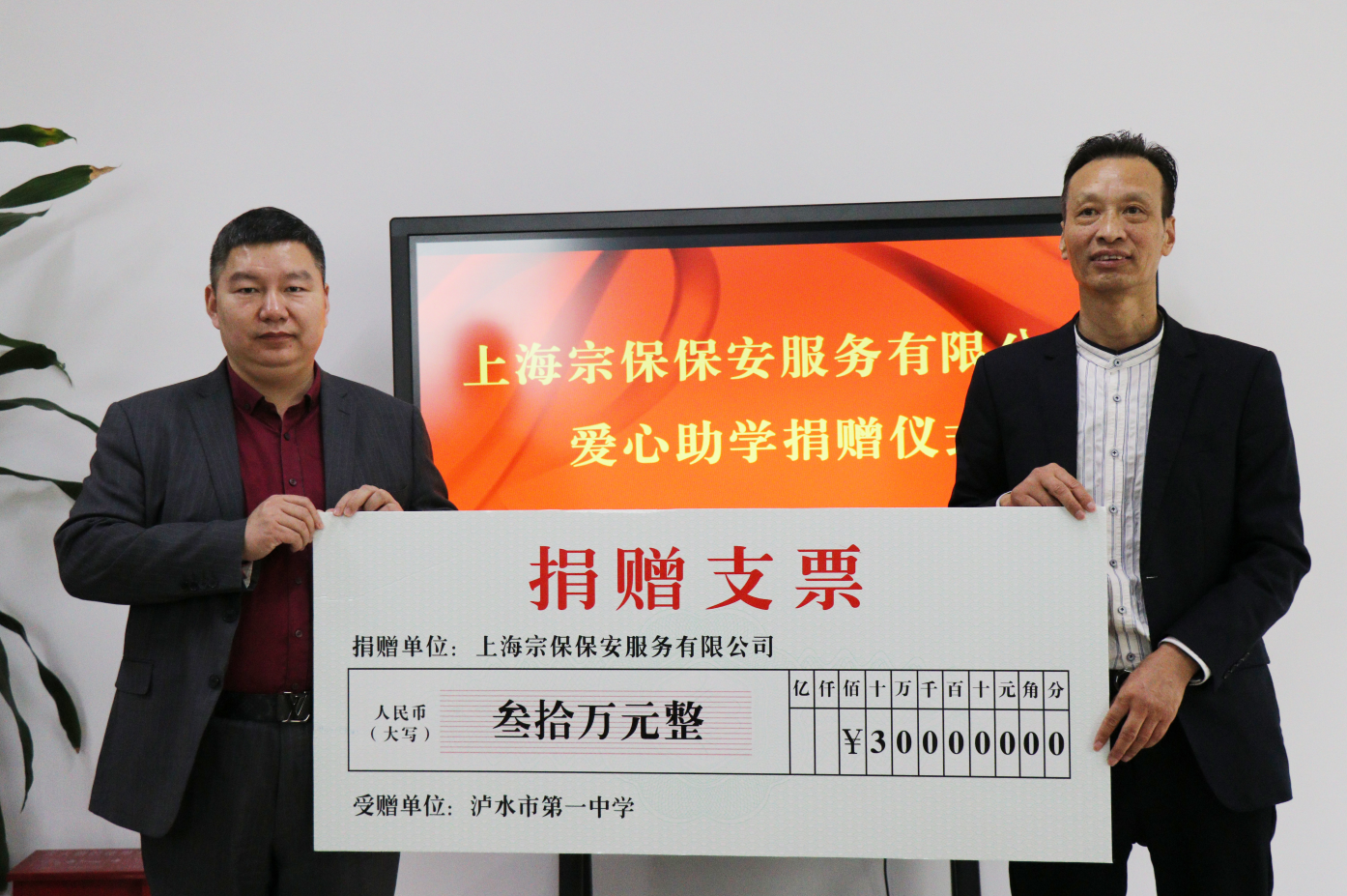 公司副總經(jīng)理?xiàng)铊币恍袑3虂淼綖o水市第一中學(xué)參觀學(xué)校教學(xué)建設(shè),參加“上海宗保保安服務(wù)有限公司愛心助學(xué)捐贈儀式”,代表公司向?yàn)o水市第一中學(xué)捐助資金30萬元,用于幫助貧困家庭學(xué)子圓夢學(xué)業(yè)。