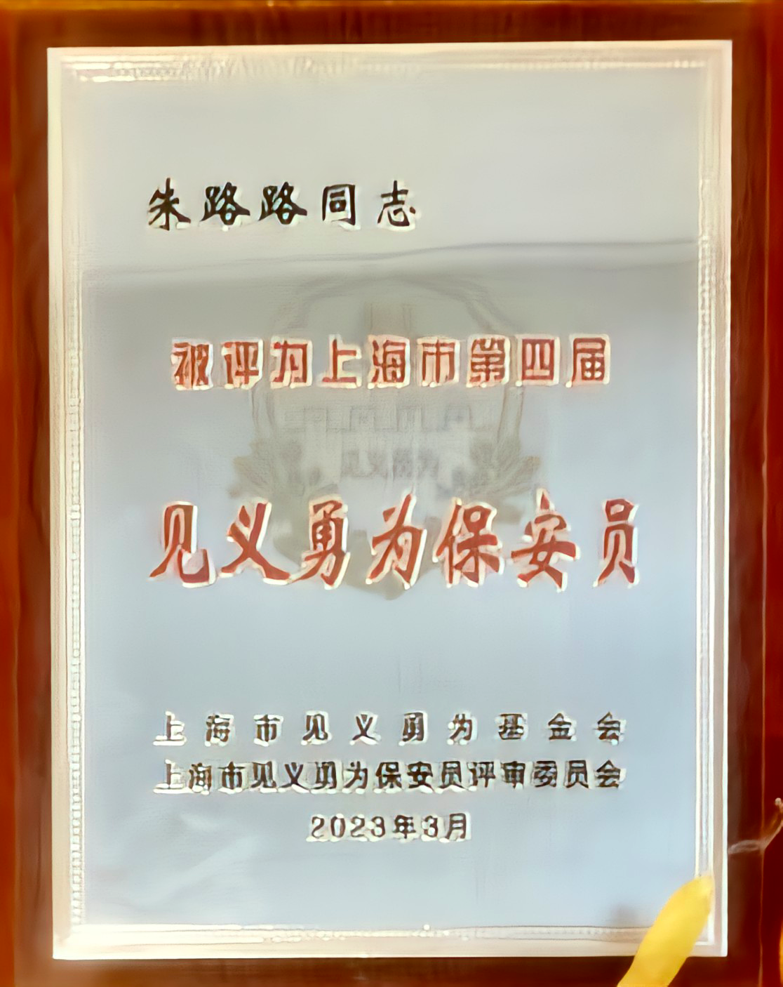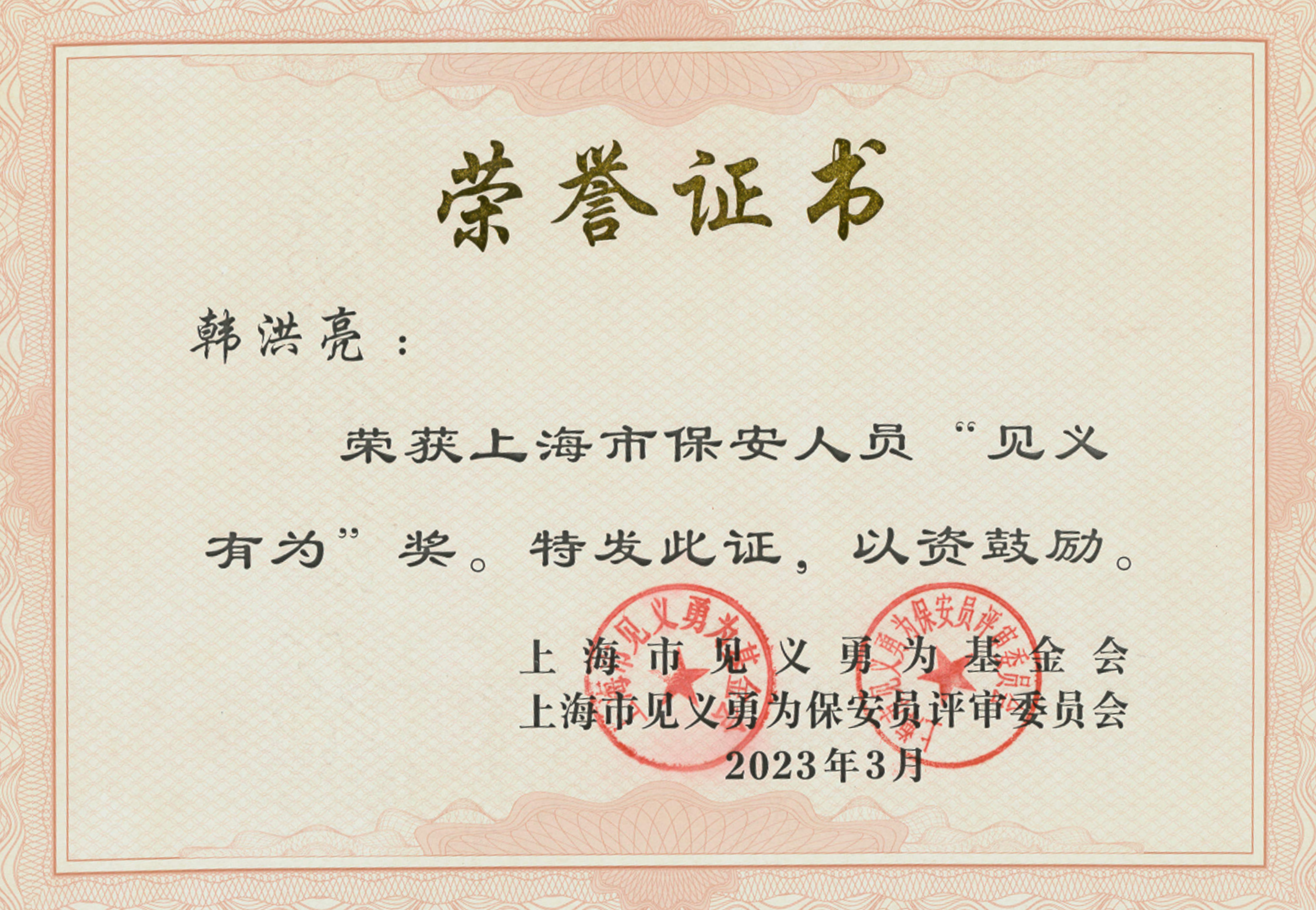 宗保公司員工朱路路、馬凱凱被授予“上海市見義勇為保安員”稱號,韓洪亮榮獲上海市保安人員“見義有為”獎。