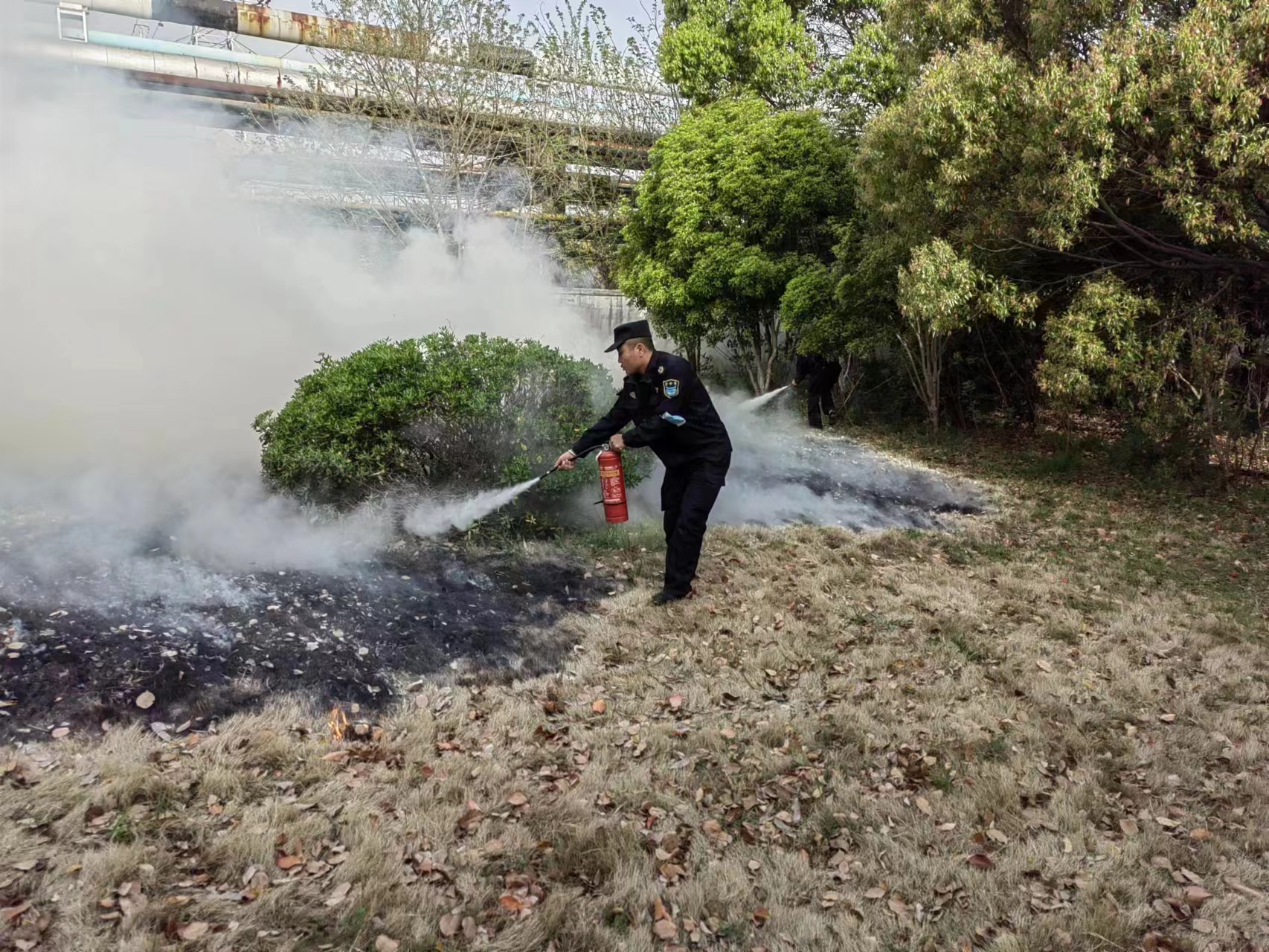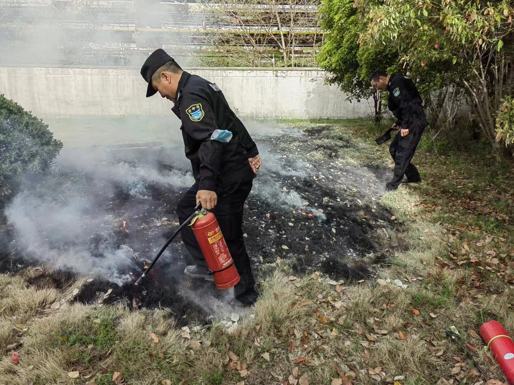 3人急忙奔到門崗室拿起滅火器趕往現(xiàn)場(chǎng),此時(shí)草坪正在燃燒,且火借風(fēng)勢(shì)逐漸擴(kuò)大。3人迅速拉開滅火器,趕緊對(duì)準(zhǔn)著火位置滅火,由于撲滅及時(shí),避免了火情大范圍蔓延,最大限度地降低了植被損失。