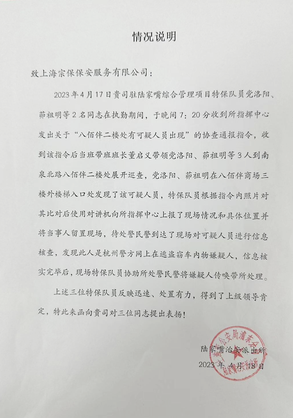 4月18日,宗保公司駐陸家嘴綜合管理項目收到浦東公安分局陸家嘴治安派出所的情況說明,表揚員工黨洛陽和茆祖明在抓獲犯罪嫌疑人行動中的良好表現(xiàn)。