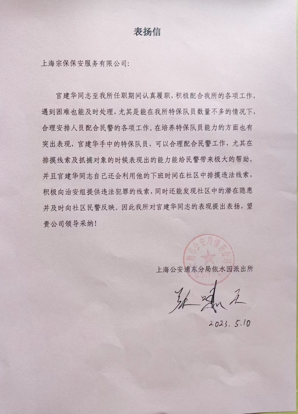 5月10日,宗保公司駐浦東公安分局依水園派出所輔助項(xiàng)目收到依水園派出所副所長(zhǎng)張嘯天的感謝信,信中對(duì)公司員工宮建華的工作表現(xiàn)給予了表揚(yáng)。