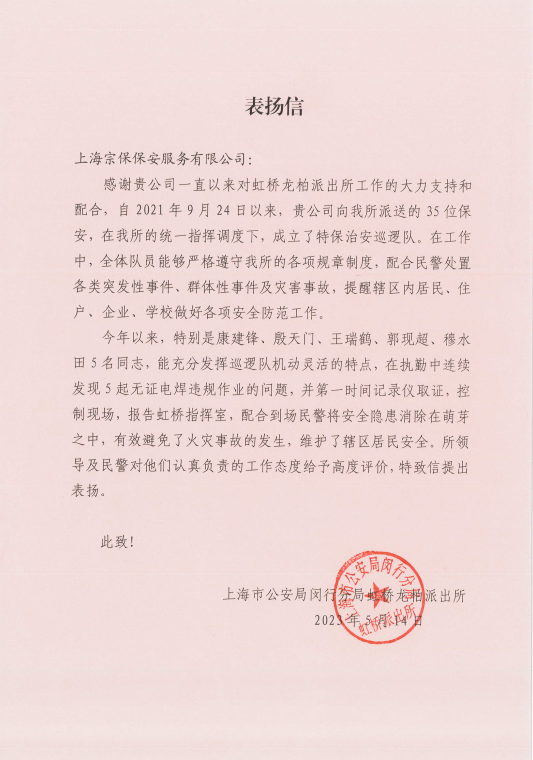 5月14日,宗保公司駐閔行區(qū)虹橋龍柏派出所輔助項(xiàng)目收到閔行公安分局虹橋龍柏派出所的表揚(yáng)信,感謝公司對派出所工作的大力支持和配合,表揚(yáng)公司員工在開展警務(wù)輔助中的良好表現(xiàn)。