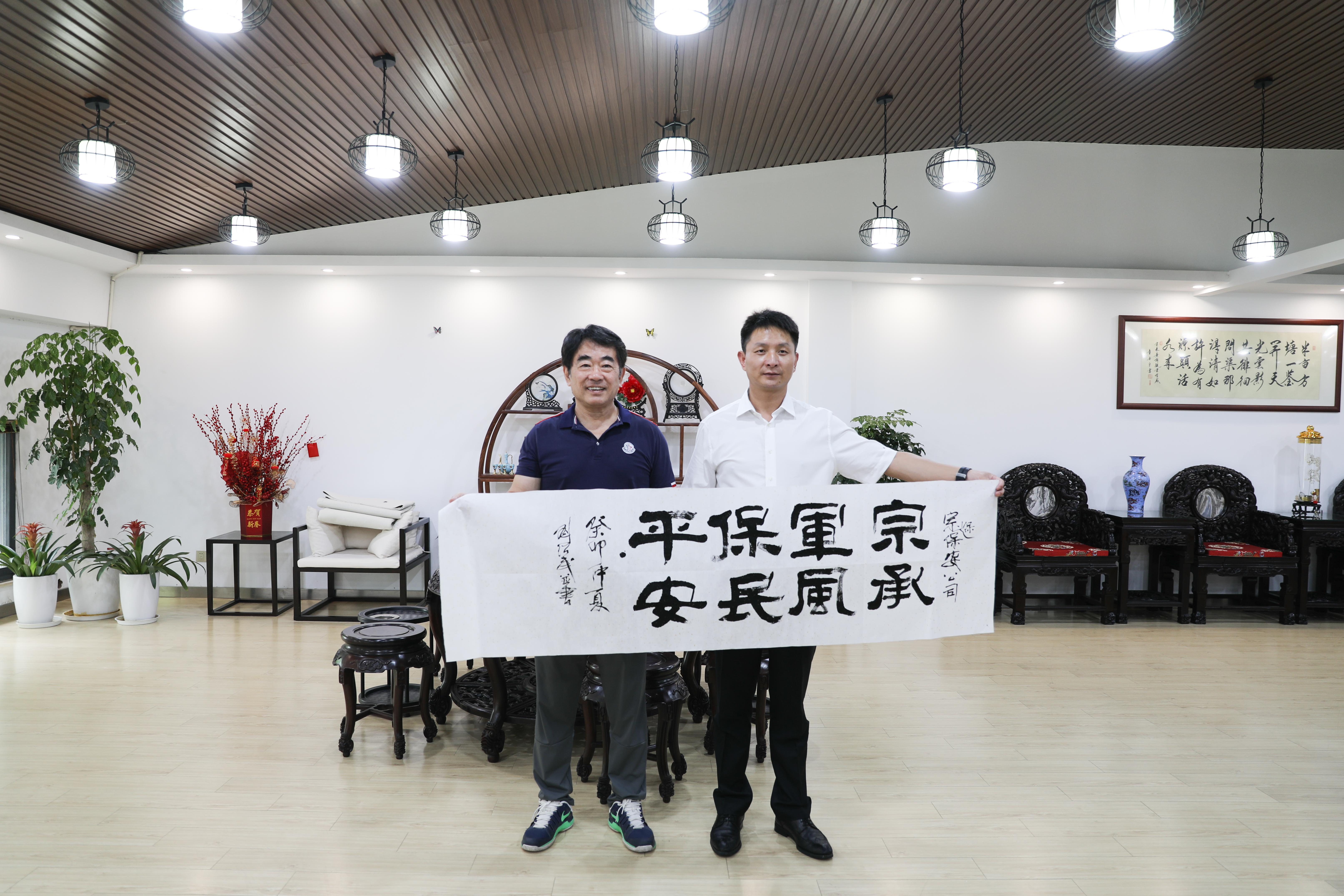 劉紹武第一副會長一行首先來到公司運營指揮中心,觀看了《擦亮軍人底色 彰顯使命擔(dān)當(dāng)》視頻短片,接著又察看了公司榮譽墻、退役軍人員工照片墻和黨建文化墻,參觀了公司基地、員工宿舍和培訓(xùn)大禮堂。隨后一行人又來到公司書畫室,劉紹武第一副會長應(yīng)邀為公司即興題寫了“宗承軍風(fēng) 保民平安”的書法。