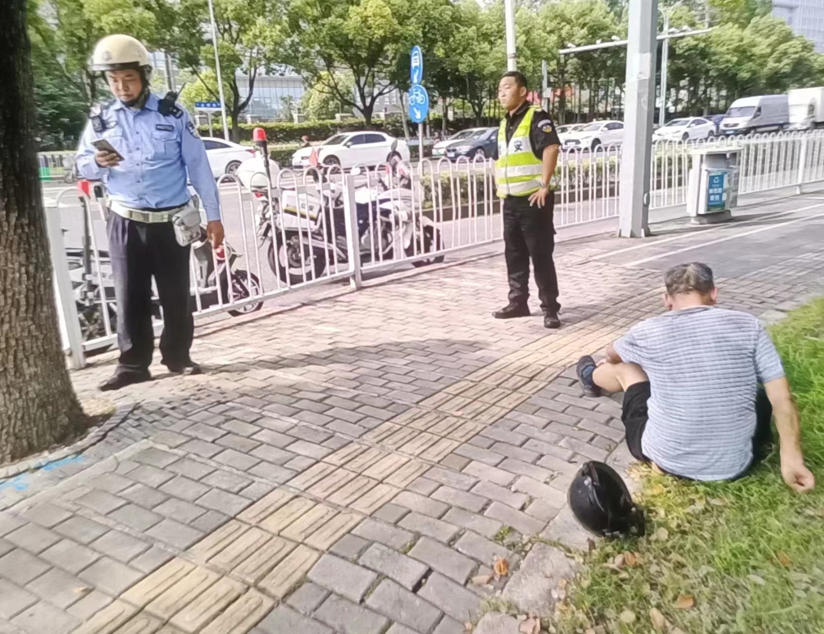 當(dāng)日8:30,公司員工蔡瀚在金都華寧路口西北角巡邏時(shí),發(fā)現(xiàn)一位老人摔倒在地,一輛電瓶車(chē)側(cè)翻在旁邊。蔡瀚見(jiàn)狀趕緊上前察看,并將情況報(bào)告了項(xiàng)目負(fù)責(zé)人。