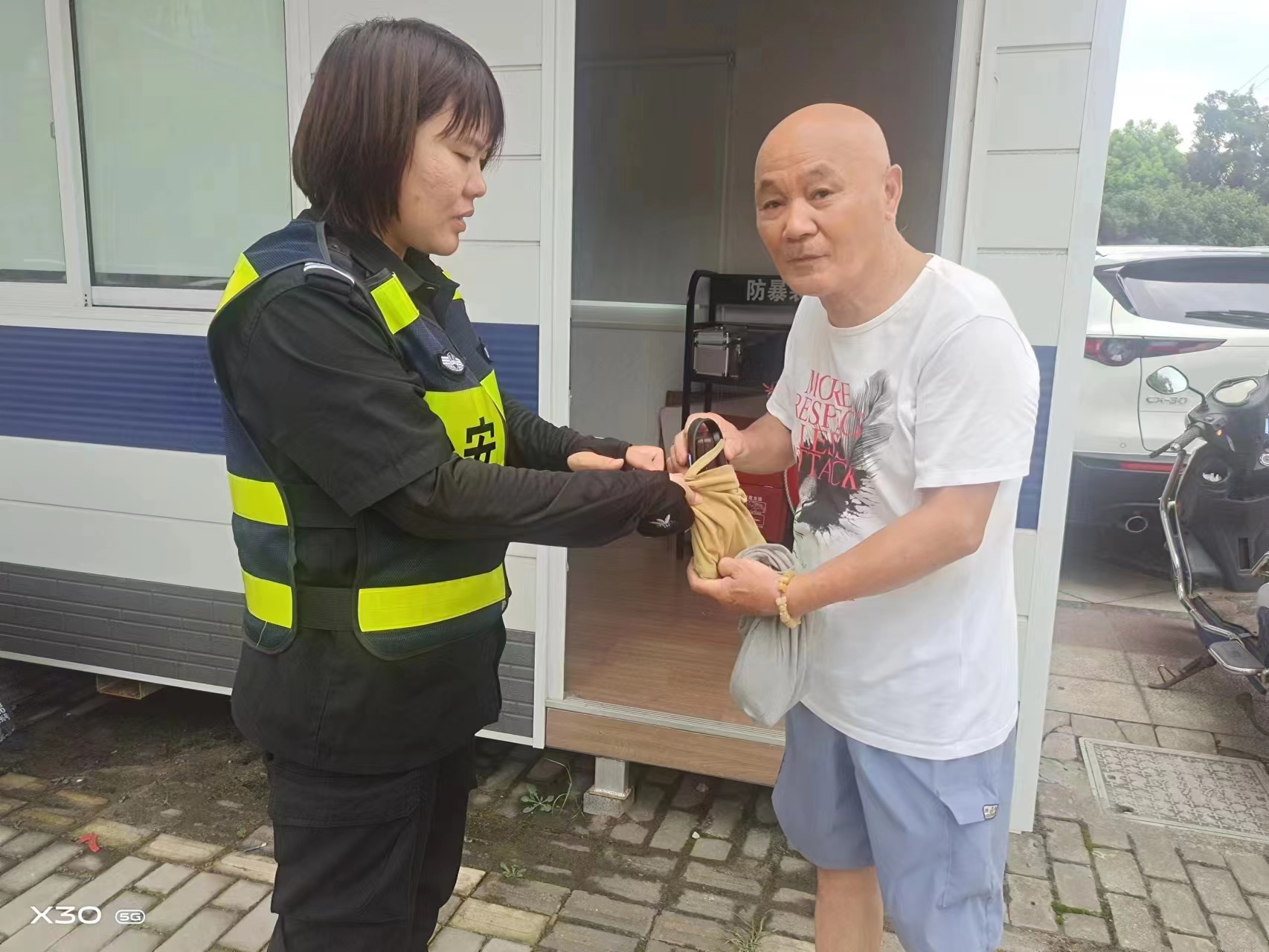 7月24日7:42,宗保公司駐浦東新區(qū)周東派出所輔助項(xiàng)目員工朱心玲和楊伊卓在沈梅東路巡邏時,撿到一個黃色小布袋,內(nèi)有一部vivo手機(jī)。而恰在此時,手機(jī)鈴聲響起,朱心玲接通手機(jī),電話是一男子打來的,他自稱是手機(jī)的失主。朱心玲簡單向他了解了情況,隨即告訴他自己的具體位置,約好碰面的時間。大概過了十幾分鐘,一位老人趕到現(xiàn)場,確認(rèn)老人是失主后,楊伊卓就將手機(jī)交還給了他。老人拿著手機(jī),一個勁地夸贊宗保員工,同時還想請兩人吃飯表示感謝,被兩人婉言謝絕了。
