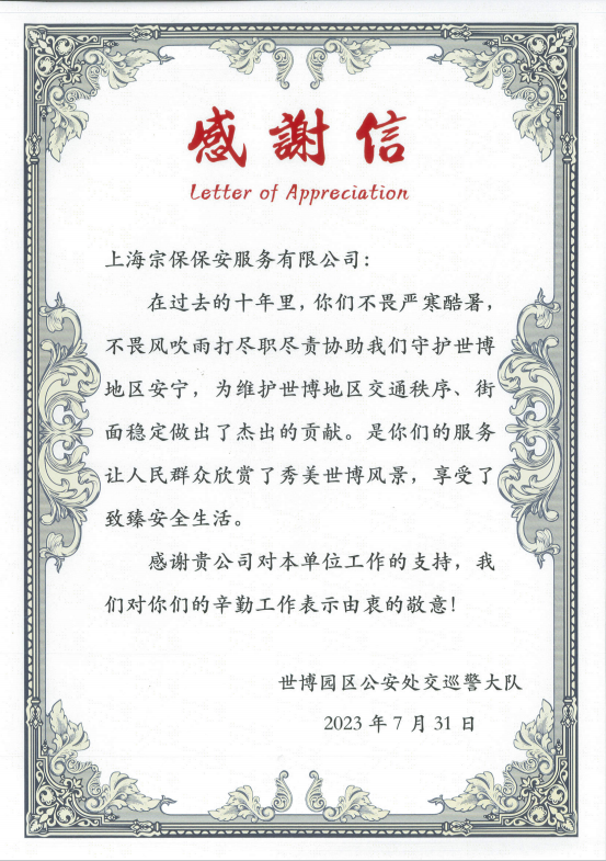 世博園區(qū)公安處交巡警大隊(duì)贈(zèng)送錦旗致感謝信,是對(duì)公司駐世博園項(xiàng)目工作的充分肯定,既是一份榮譽(yù)和褒獎(jiǎng),更是一種激勵(lì)和鼓舞。員工們表示,將不辜負(fù)領(lǐng)導(dǎo)的期望,繼續(xù)保持和發(fā)揚(yáng)扎實(shí)工作、愛崗敬業(yè)的工作作風(fēng),再接再厲,再創(chuàng)佳績,為助力轄區(qū)平安建設(shè)續(xù)寫新的篇章。