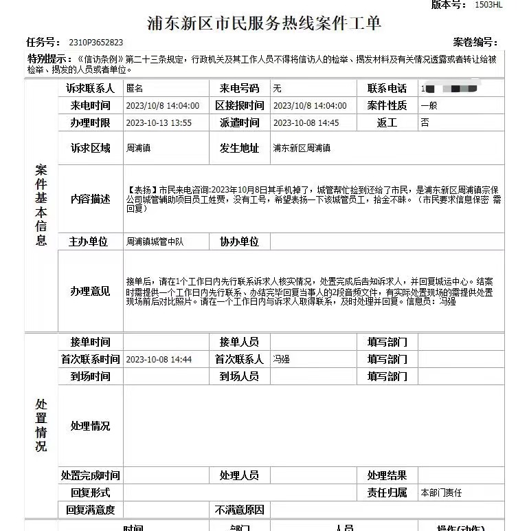 10月8日13:30,宗保公司駐浦東新區(qū)周浦市容項(xiàng)目員工賈勝輝在周秀路巡查時(shí),撿到一部華為手機(jī)。因手機(jī)設(shè)有鎖屏密碼,一時(shí)無(wú)法聯(lián)系到失主,賈勝輝報(bào)告班組長(zhǎng)后便在原地等待失主。大約過(guò)了10多分鐘,一男子打來(lái)電話自稱是失主,賈勝輝了解情況后,就與他約好在周浦鎮(zhèn)城管執(zhí)法中隊(duì)碰面。很快,男子趕到約定地點(diǎn),成功地解開(kāi)了鎖屏密碼。賈勝輝確認(rèn)男子是失主后,將手機(jī)交還給了他。男子拿著手機(jī)連連向賈勝輝道謝,并特意撥打了12345上海市民熱線,贊揚(yáng)宗保公司駐周浦市容項(xiàng)目員工賈勝輝拾金不昧的行為。