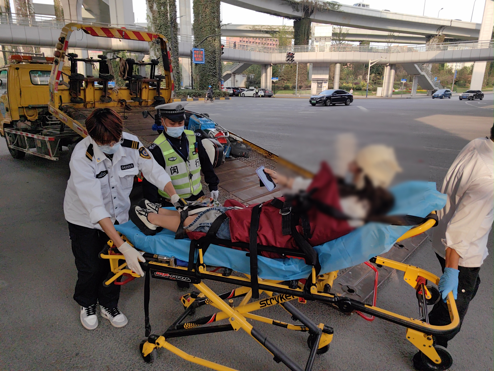 很快,120急救車和民警趕到現(xiàn)場,醫(yī)護人員對受傷女駕駛員進行急救處理,初步確認其左側(cè)眉骨和鎖骨骨折。隨后,王團結(jié)和阿克補萬又協(xié)助醫(yī)護人員將傷者抬上救護車,送往醫(yī)院緊急救治。