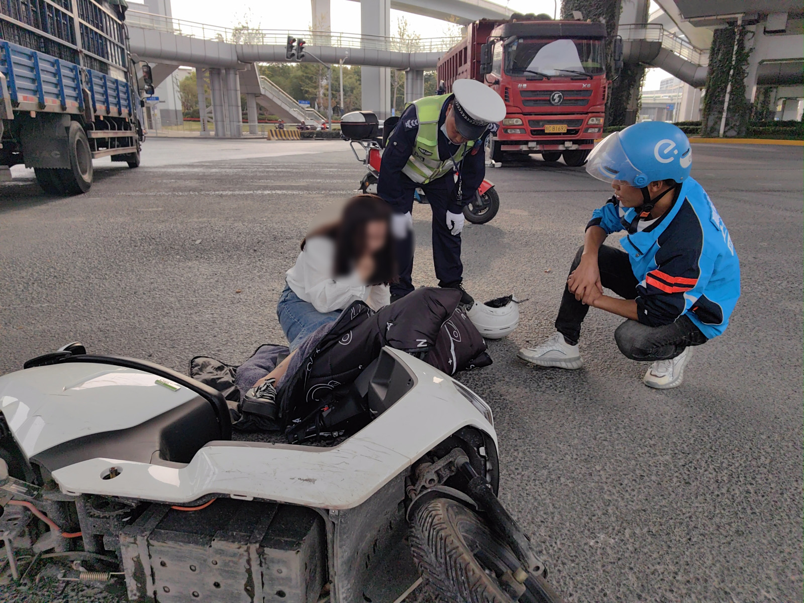 兩名員工見狀趕緊跑過去察看,一位女駕駛員的頭摔貼在地面上左側(cè)眉骨處有血液流出,趴著不能動彈,傷勢似乎很嚴重,王團結(jié)立即撥打了120急救電話和交警隊指揮室電話。同時,為防止發(fā)生二次事故,兩人站在原地指揮車輛有序繞行,疏散圍觀群眾,維持現(xiàn)場交通秩序。