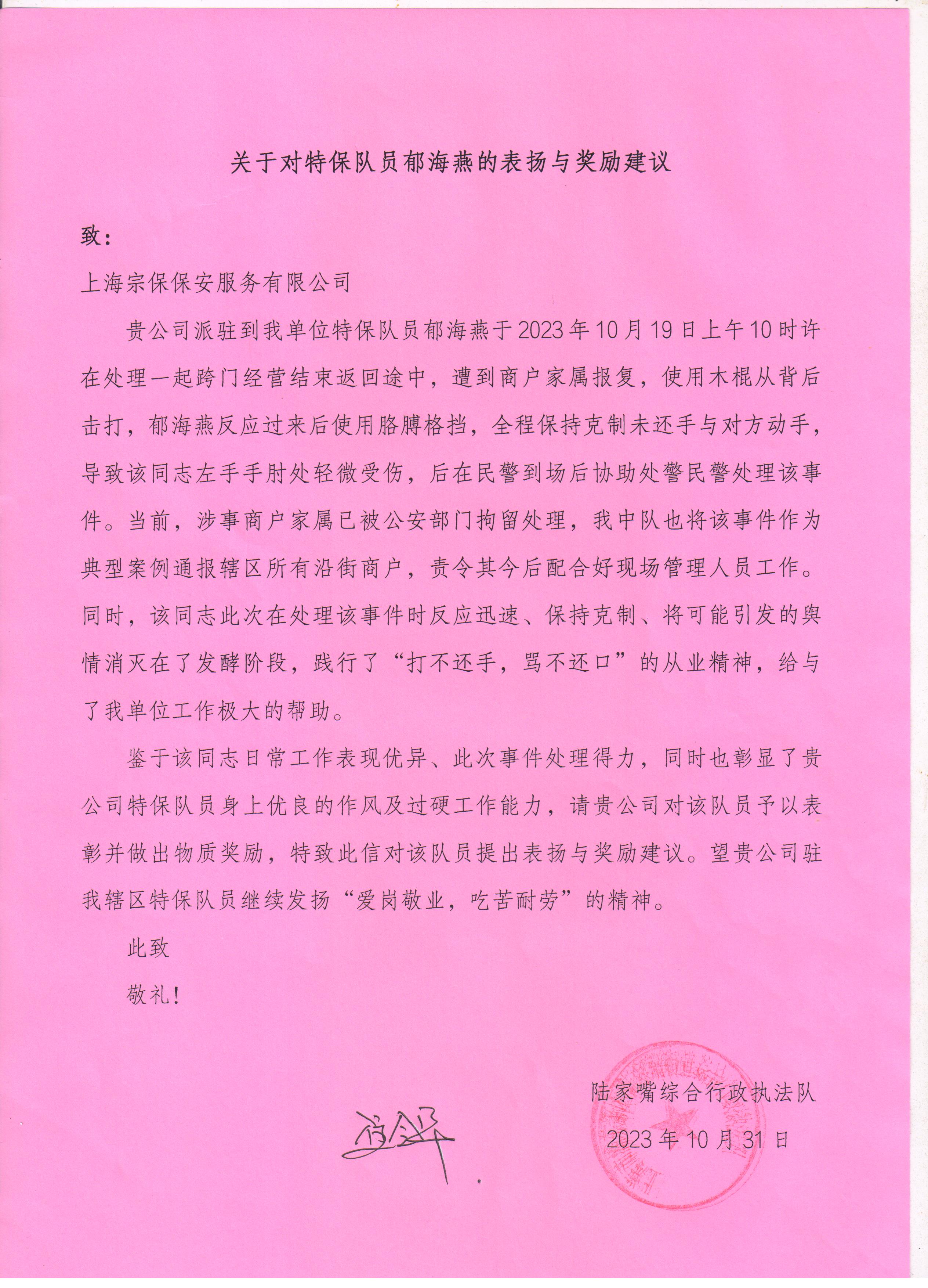 10月31日,宗保公司駐陸家嘴綜合行政執(zhí)法隊輔助項目收到陸家嘴綜合行政執(zhí)法隊的表揚(yáng)信,信中表揚(yáng)了公司員工郁海燕忍辱克制的優(yōu)秀表現(xiàn)。