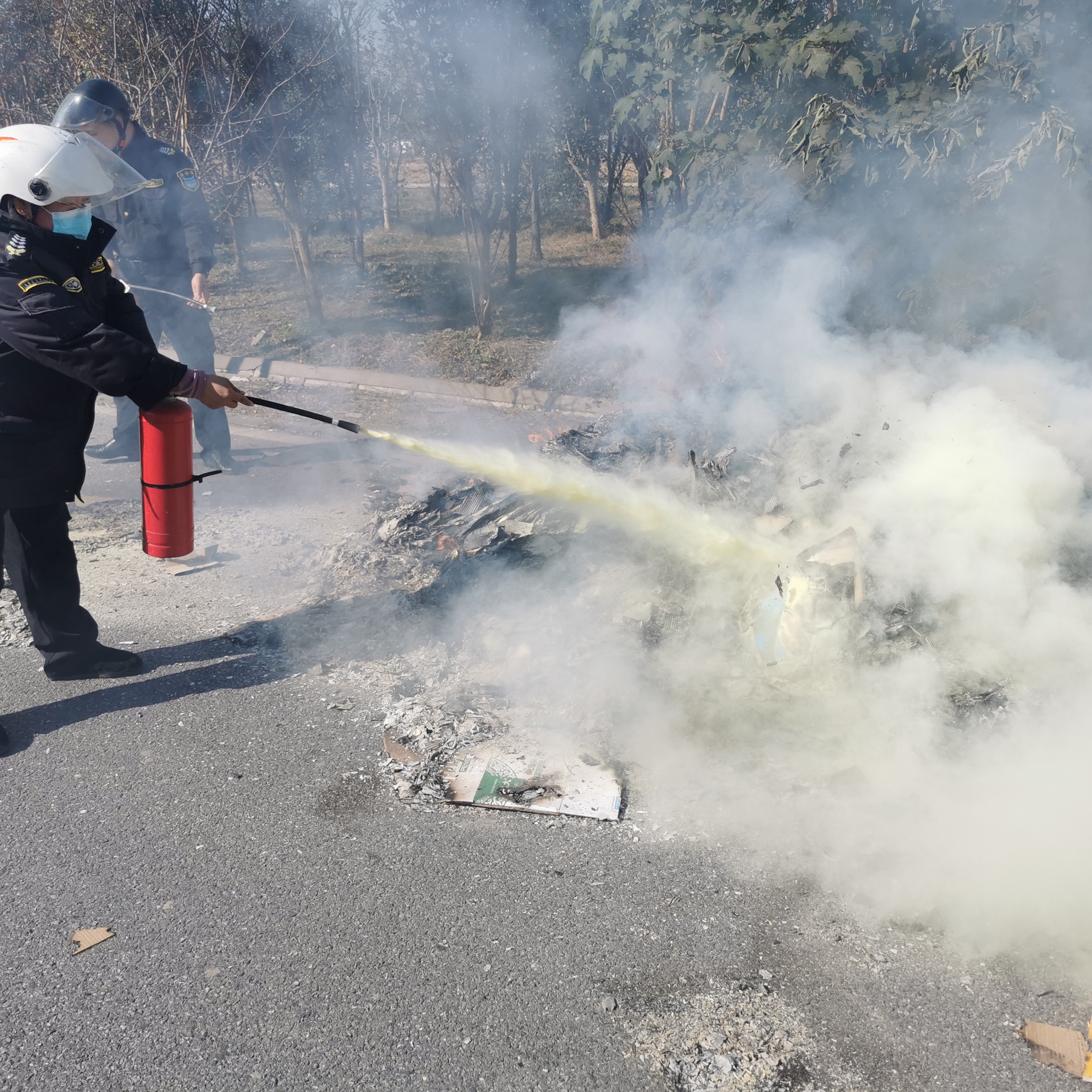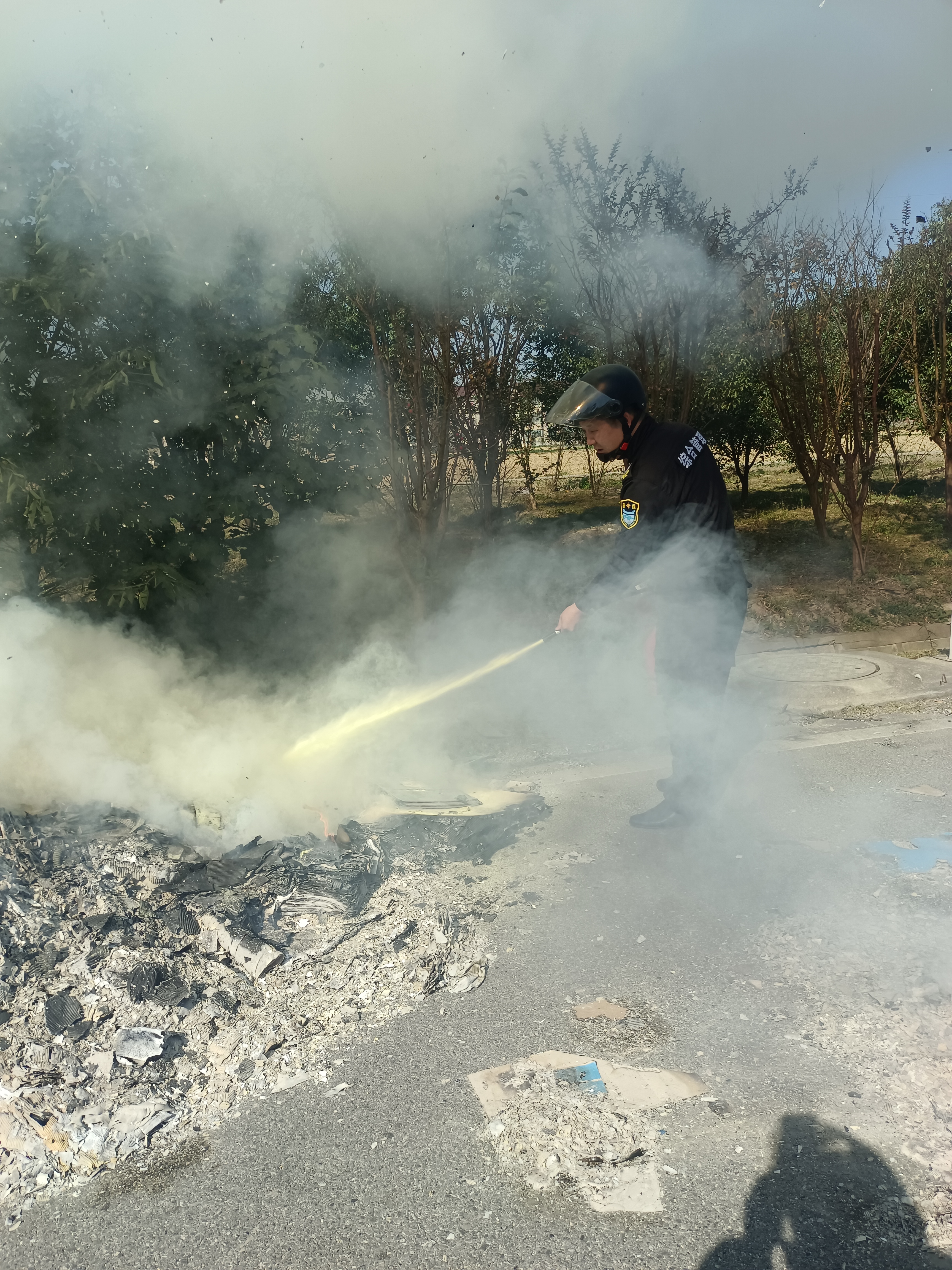 當(dāng)日10:50,宗保公司員工王夢(mèng)宇在拱北路與拱亮路交叉口值勤時(shí),發(fā)現(xiàn)前方路邊空地內(nèi)冒著滾滾濃煙,便立刻叫上附近同事前去察看,原來(lái)是路邊院墻內(nèi)側(cè)堆放的廢棄建材起火。