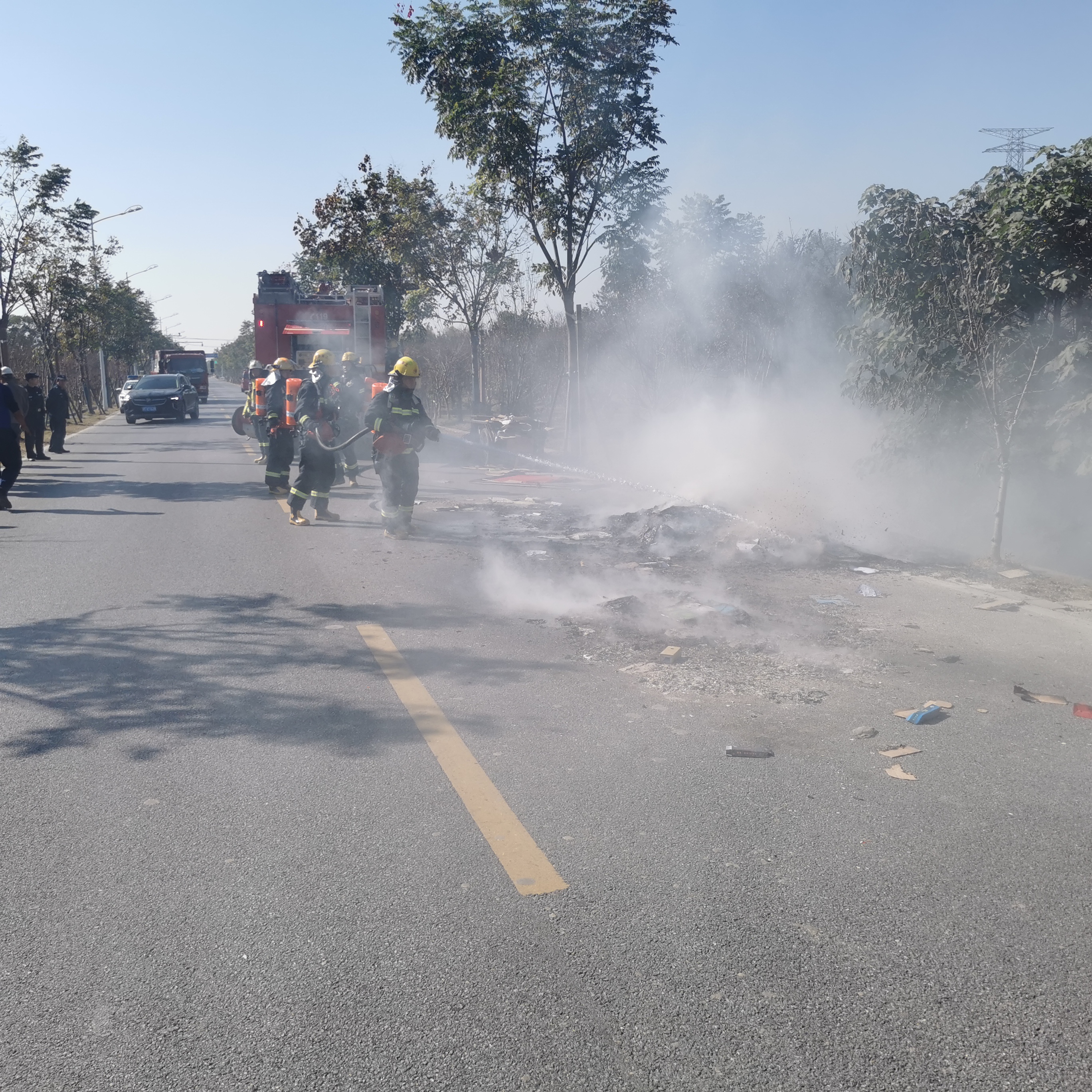 戚思功第一時(shí)間通知附近的2名員工攜帶滅火器前往現(xiàn)場(chǎng),并撥打了119應(yīng)急救援電話報(bào)警。因事發(fā)地位于觀工路主干道,趕到現(xiàn)場(chǎng)的戚思功疏導(dǎo)車輛交替通行,龍鳳嬌和張軒笛則忙著把廢品從電動(dòng)三輪車上卸下,避免引發(fā)電動(dòng)車著火。