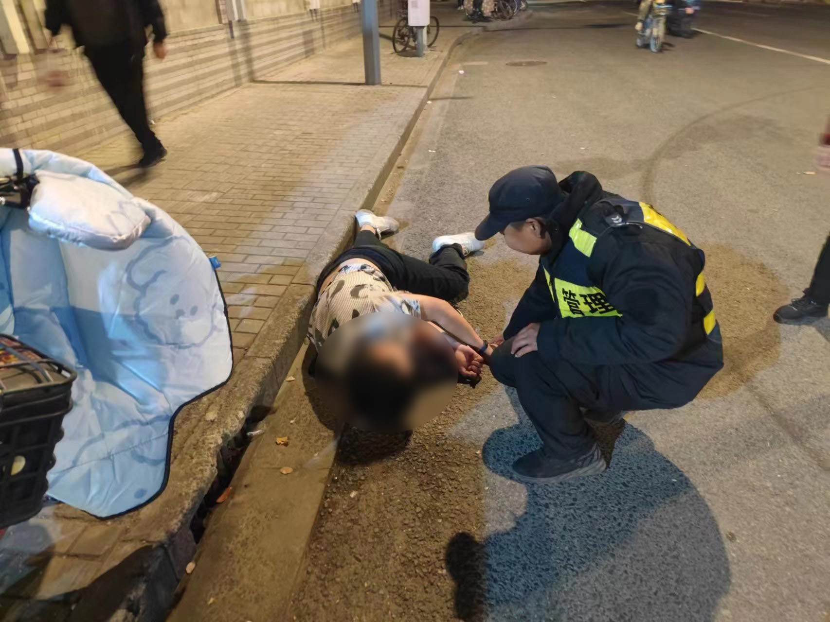 當(dāng)日20:00,公司員工陳靜潤(rùn)和龐寶山在楊思路地鐵站東側(cè)巡查時(shí),看見一名男子躺在地上,便趕緊上前察看。男子身上散發(fā)著濃濃的酒味,昏睡著疑似飲酒過(guò)量,輕拍其未能喚醒。