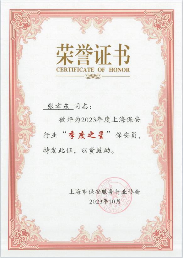 近日,上海市保安服務(wù)行業(yè)協(xié)會公布了2023年第三季度“季度之星”評選結(jié)果,上海宗保保安服務(wù)有限公司4名員工獲此殊榮。