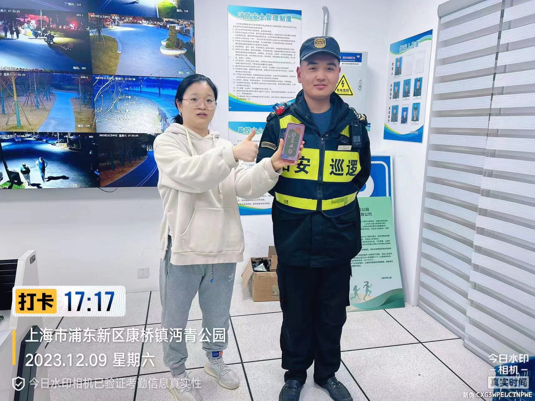 12月16日21:36,宗保公司駐浦東新區(qū)海印哈鄰里項目員工江代華在沈梅東路209號巡查時,撿到一部小米手機。江代華考慮到失主丟了手機可能會馬上返回尋找,于是便在原地等待。約過了10分鐘,仍未見失主前來,江代華就把手機帶到值班崗?fù)ぃ⑶闆r報告了班組長。22:18,一女子打來電話急切地詢問手機,江代華了解了基本情況,隨即與她約好碰面地點。很快,一位身穿黑色馬甲的女子來到約定地點認(rèn)領(lǐng)手機。江代華核實確認(rèn)該女子是失主后,就將手機交還給了她。