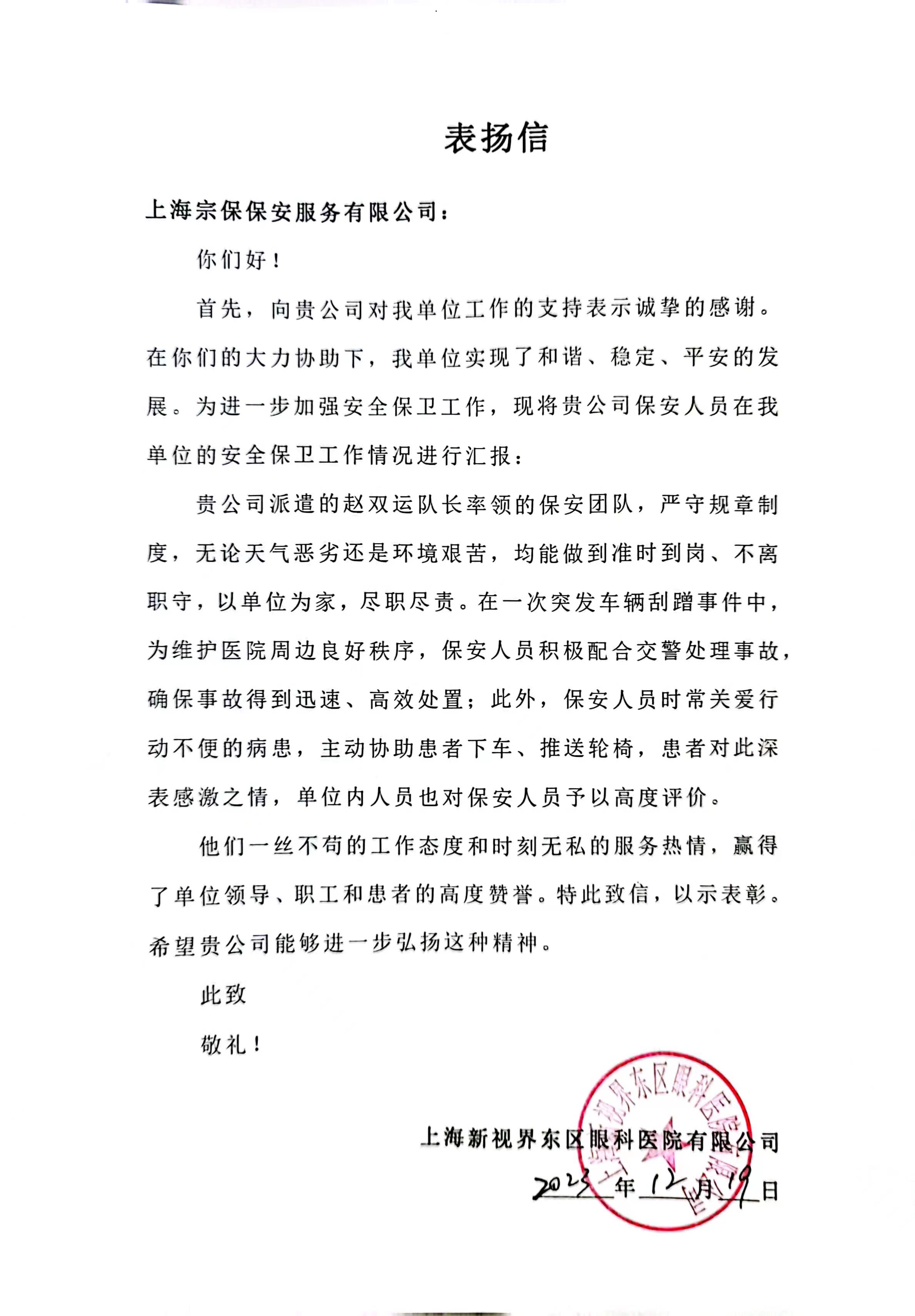 12月19日,宗保公司收到上海新視界眼科醫(yī)院有限公司的表?yè)P(yáng)信,感謝公司對(duì)醫(yī)院工作的大力支持和配合,表?yè)P(yáng)公司員工趙雙運(yùn)愛(ài)崗敬業(yè)的出色表現(xiàn)。