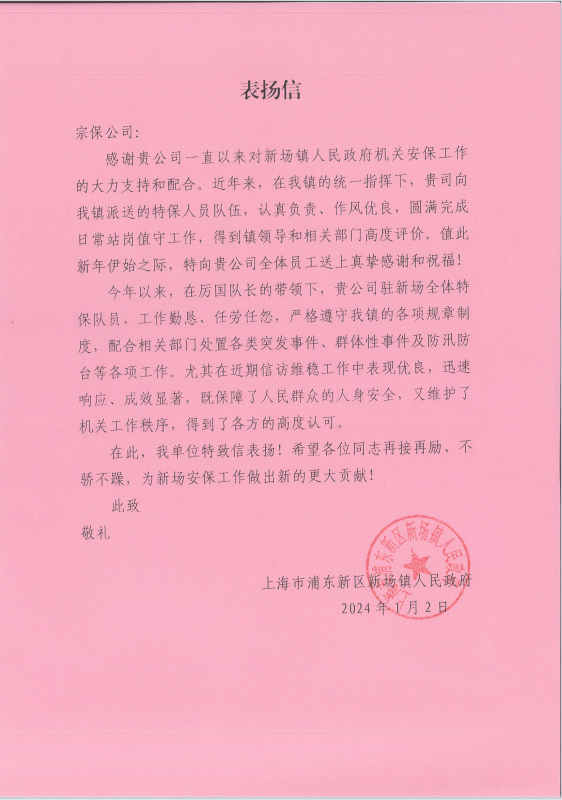 1月2日,宗保公司駐浦東新區(qū)新場鎮(zhèn)人民政府輔助項目收到鎮(zhèn)政府的表揚信,表揚項目隊長厲國,愛崗敬業(yè)、任勞任怨,素質(zhì)過硬、責(zé)任心強,團(tuán)結(jié)帶領(lǐng)項目員工嚴(yán)格遵守鎮(zhèn)政府管理規(guī)定,全力配合鎮(zhèn)相關(guān)部門做好秩序維護(hù)工作善作善為的精神。