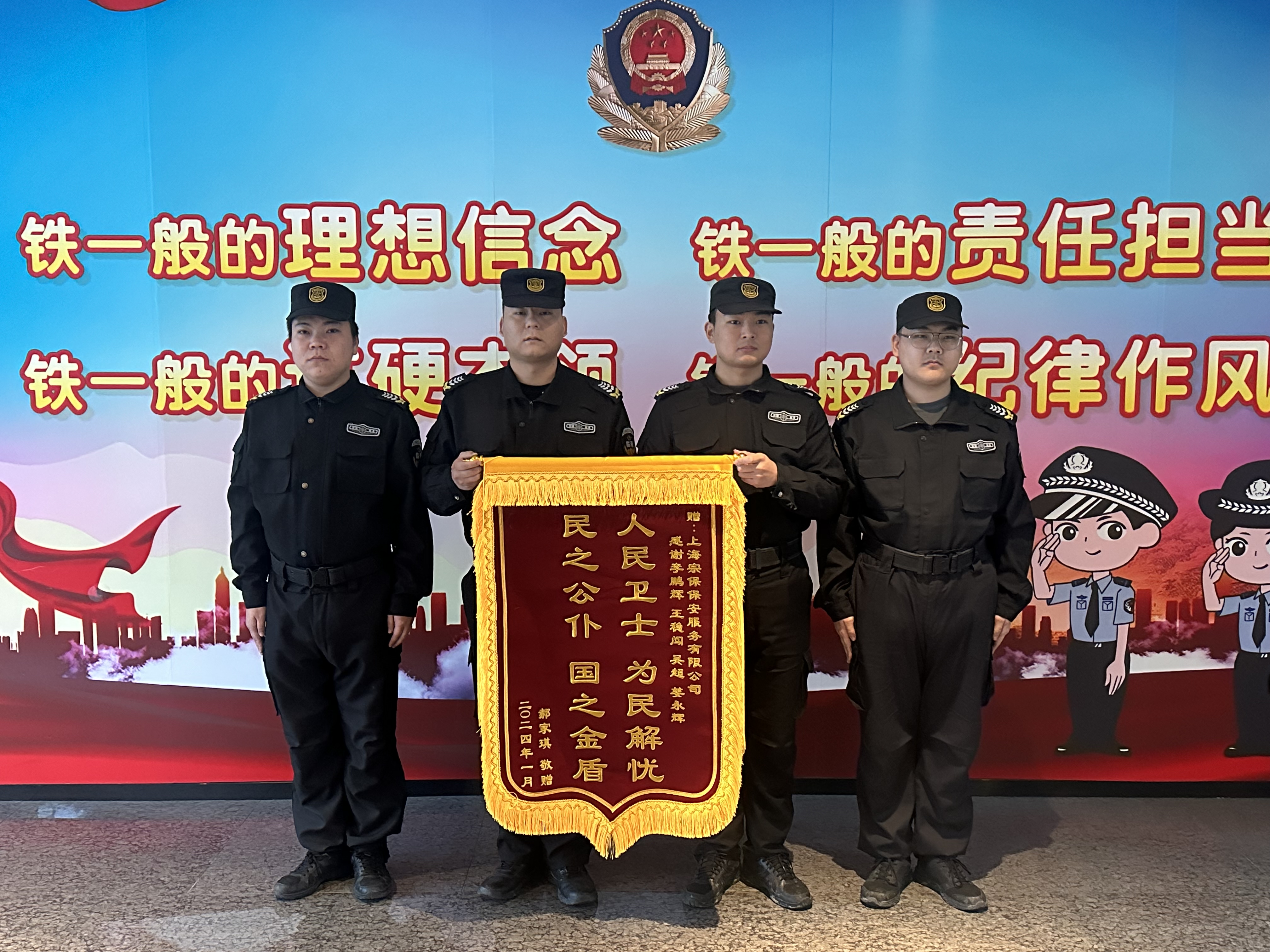 1月29日,宗保公司駐浦東新區(qū)公安分局臨港新城派出所輔助項目收到市民郝女士送來的一面繡有“人民衛(wèi)士 為民解憂 民之公仆 國之金盾”的錦旗,感謝公司員工幫其找回鉆戒的助人行為。