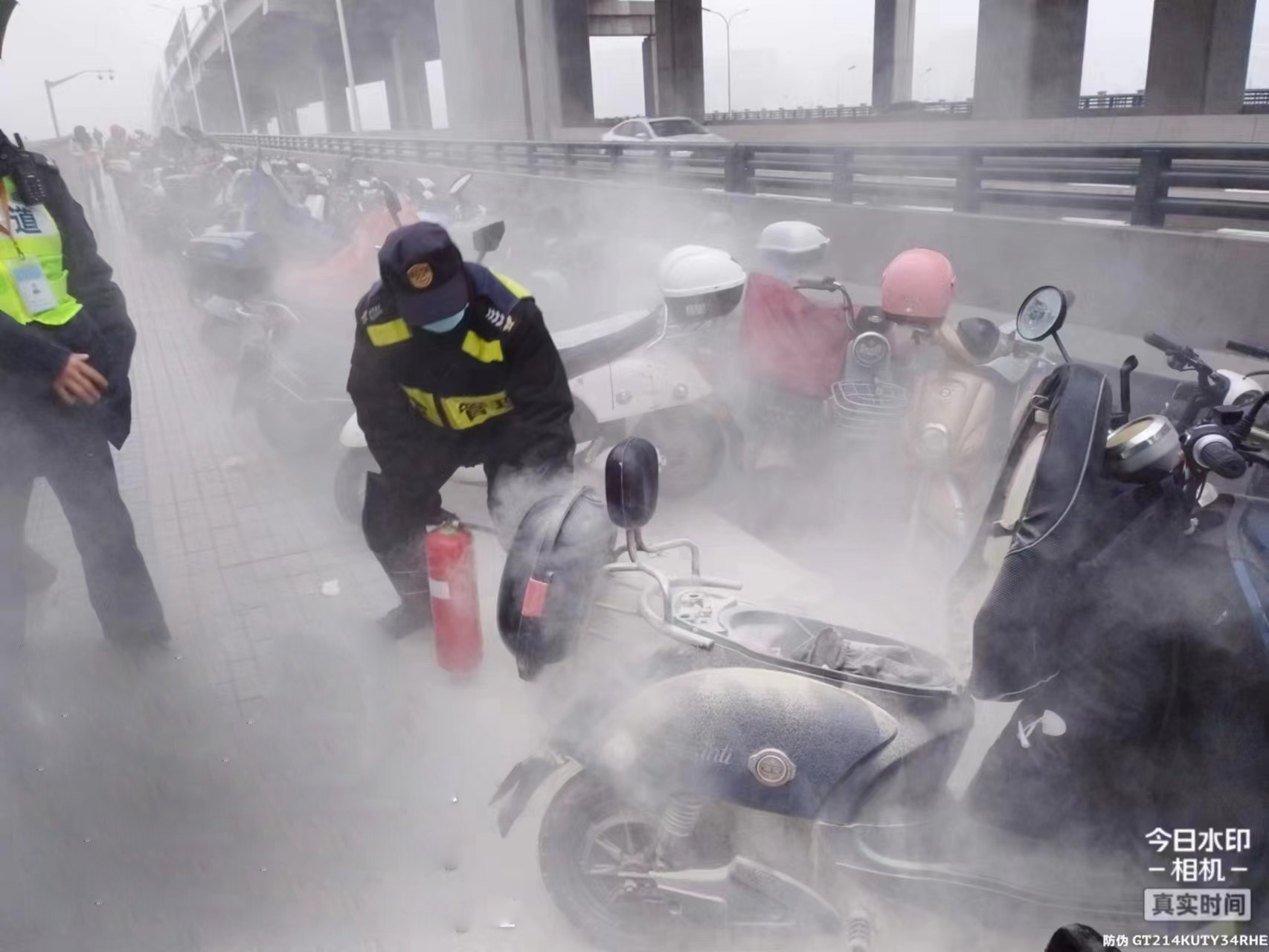 此時,電瓶車已冒起白煙,并不斷有火苗竄出,一旦電瓶爆炸極易發(fā)生危險。徐雷趕緊請周圍群眾避讓,隨后拿起滅火器對準(zhǔn)電瓶車持續(xù)噴射,很快冒火部位被撲滅,避免了危險事故發(fā)生。