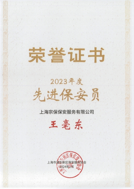 公司員工王毫東被評為2023年度“先進保安員”