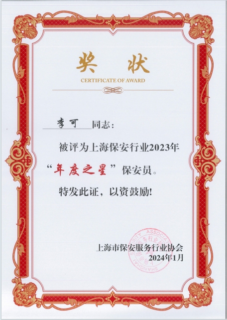 公司員工李可被評為“年度之星”保安員