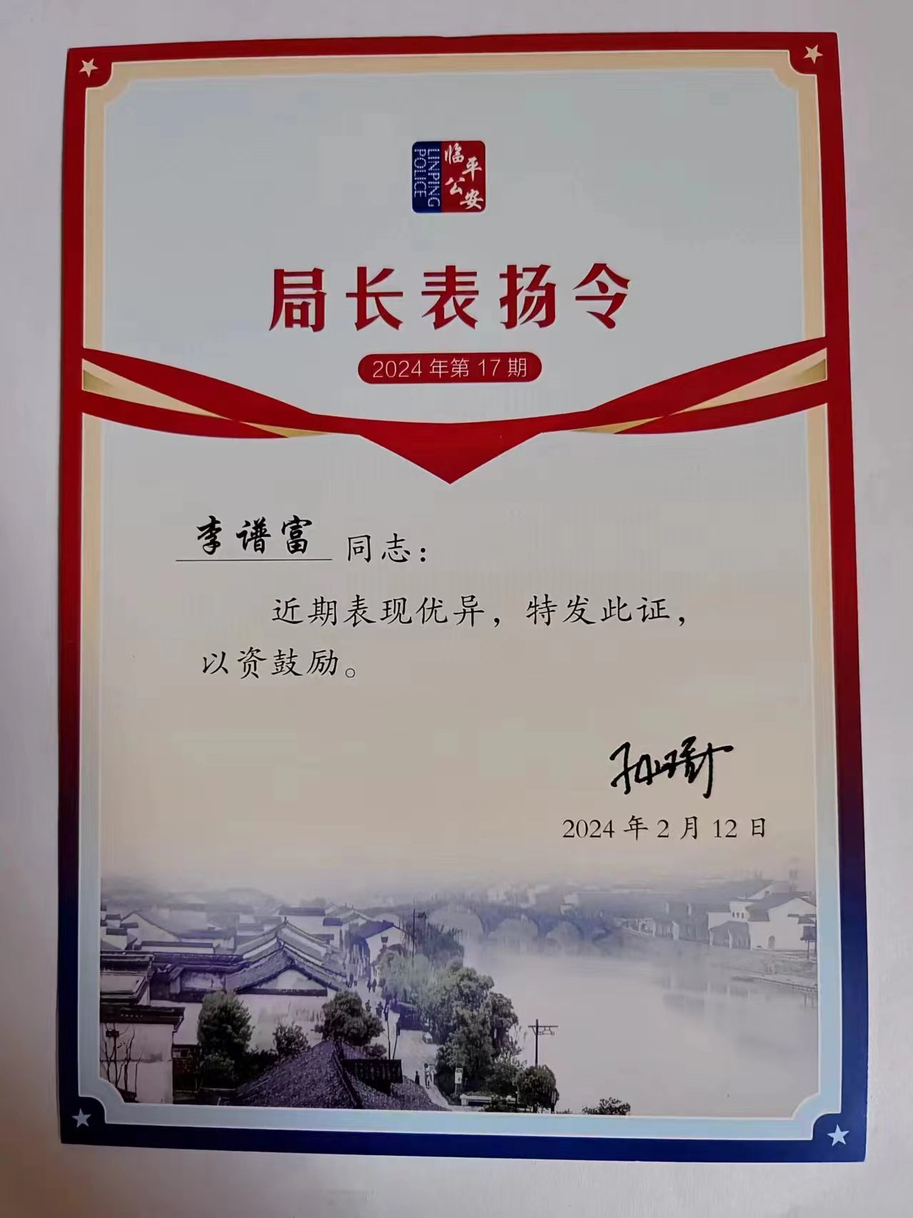 2月8日,浙江民泰駐杭州市臨平區(qū)南苑派出所輔助項(xiàng)目收到臨平區(qū)公安分局孫琦局長簽發(fā)的17號(hào)《局長表揚(yáng)令》,對公司員工李譜富協(xié)助抓獲盜竊嫌疑人的出色表現(xiàn)給予表揚(yáng)。