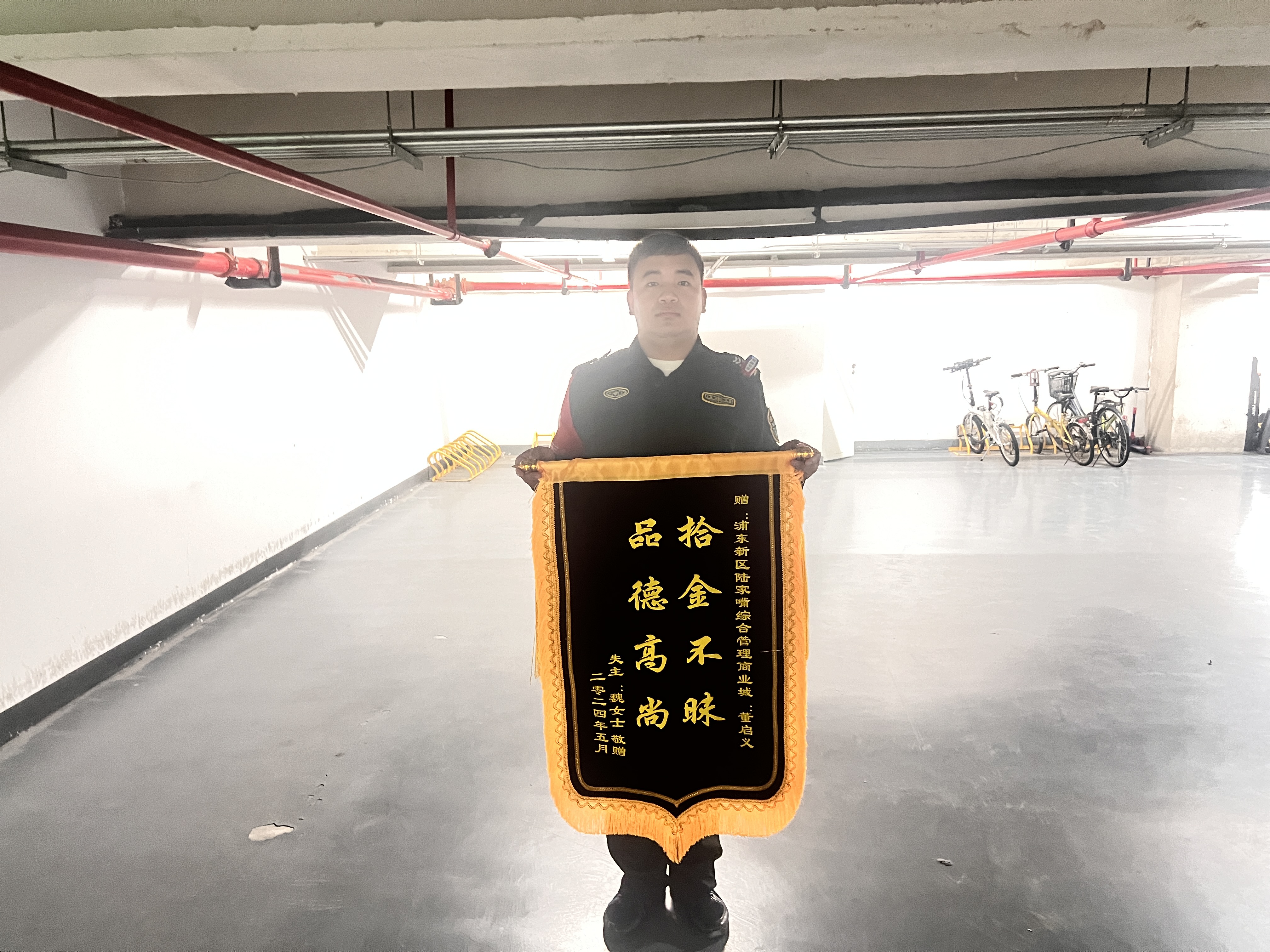5月11日,宗保公司駐浦東新區(qū)陸家嘴綜合管理項(xiàng)目員工董啟義收到市民魏女士寄來(lái)的一面繡有“拾金不昧 品德高尚”的錦旗,贊揚(yáng)他拾金不昧的助人行為。