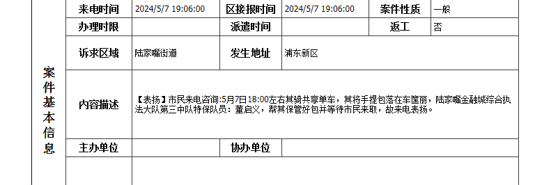 5月7日18:30,公司員工董啟義在地鐵9號(hào)線商城路站2號(hào)口附近巡查時(shí),在一輛共享單車的車筐里發(fā)現(xiàn)一個(gè)手提包,報(bào)告班組長(zhǎng)后便在原地等待。10分鐘后,一女士前來(lái)尋找。董啟義通過核對(duì)手提包里身份證等信息,確認(rèn)女士是失主后,就把手提包交還給了她。女士很高興連連道謝,還特意撥打了上海市民服務(wù)熱線12345表?yè)P(yáng)董啟義。