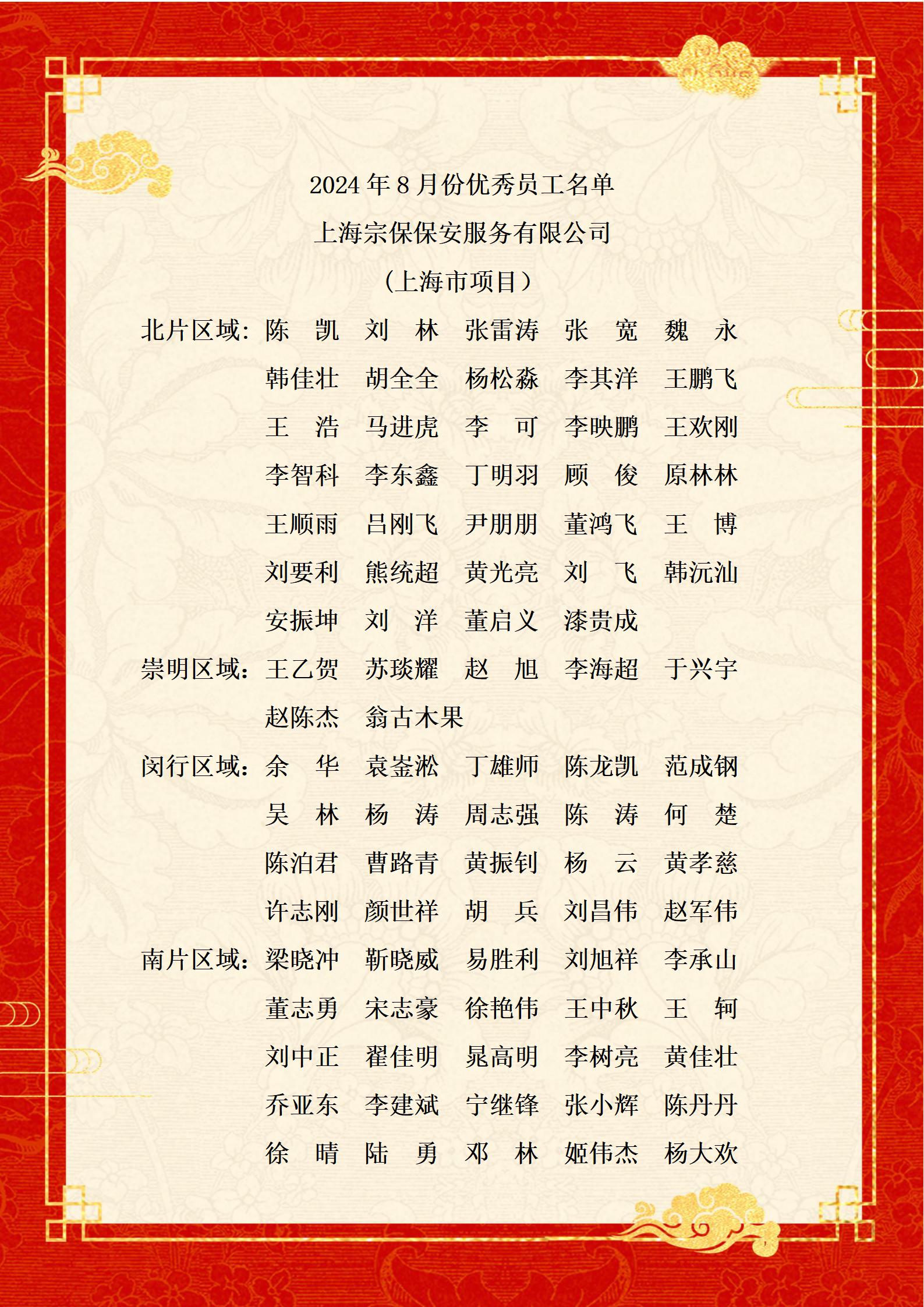 8月份,公司廣大員工根據(jù)甲方的任務(wù)要求,按照公司的部署安排,積極踐行公司“誠信為本 服務(wù)至上”的經(jīng)營理念,戰(zhàn)高溫、斗酷暑,助力完成了劉德華2024巡回演唱會—杭州站和圖靈集市上海海港足球之夜等多個大型活動臨時保障任務(wù),全力配合甲方做好了城市管理輔助、治安巡邏聯(lián)防、物業(yè)服務(wù)保障、生態(tài)環(huán)境保護(hù)、高鐵線路巡防等工作。期間,涌現(xiàn)出了一批盡心履責(zé)、崗位建功、拾金不昧、熱心助人的優(yōu)秀員工和先進(jìn)典型。