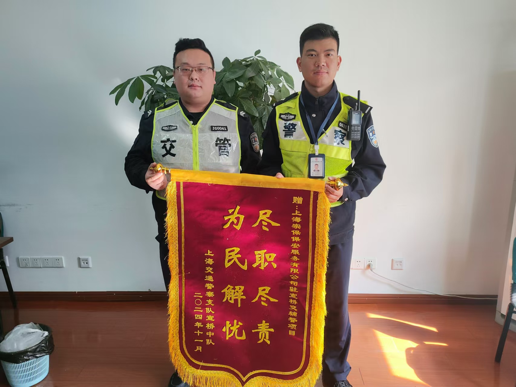 11月5日,宗保公司駐浦東新區(qū)宣橋交管輔助項(xiàng)目收到上海交通警察支隊(duì)宣橋中隊(duì)贈(zèng)送的一面繡有“盡職盡責(zé) 為民解憂”的錦旗,表?yè)P(yáng)公司員工出色的工作表現(xiàn)。