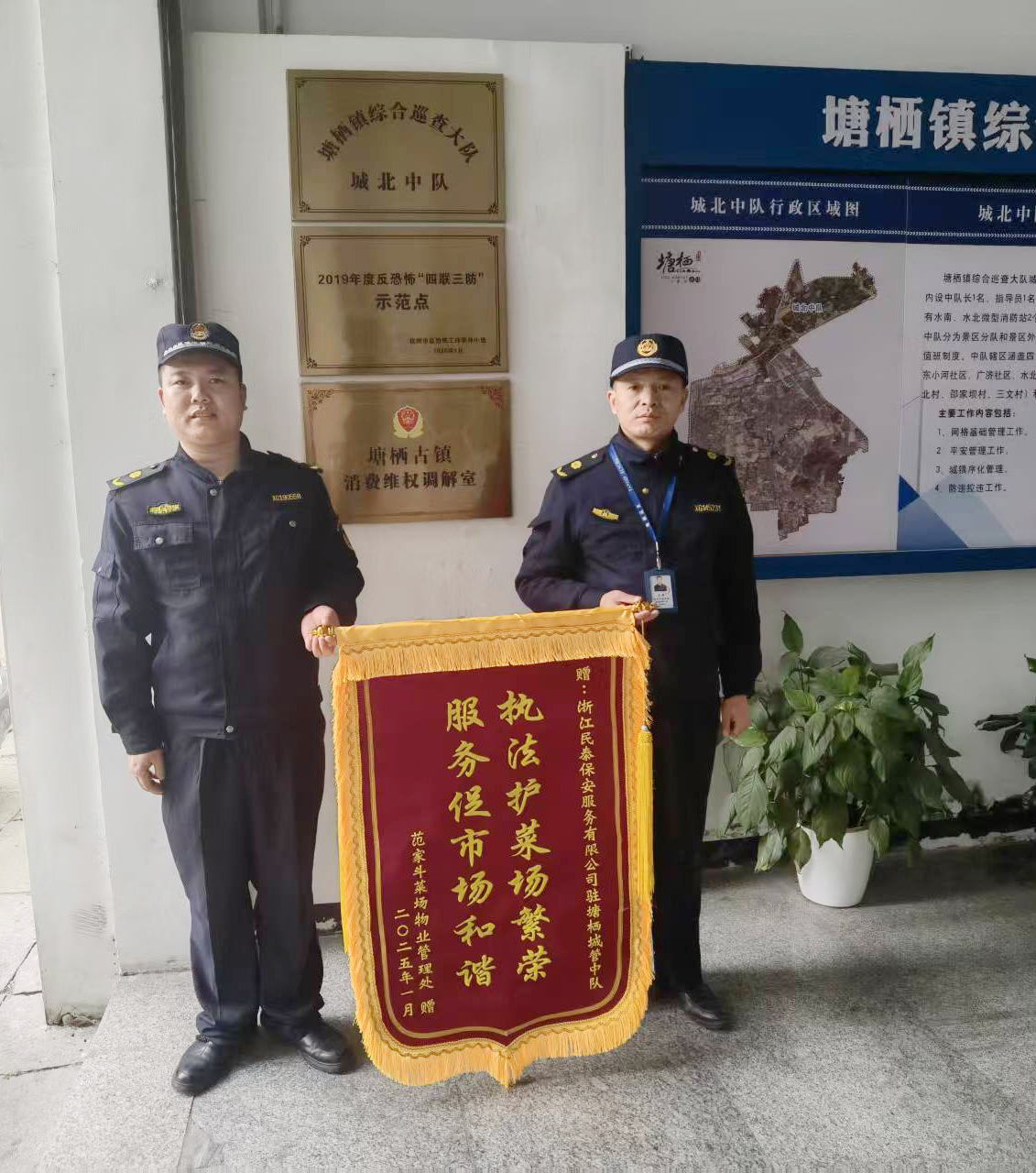 1月13日,浙江民泰公司駐杭州市臨平區(qū)塘棲城管中隊輔助項目收到范家斗菜場物業(yè)管理處贈送的繡有“執(zhí)法護(hù)菜場繁榮 服務(wù)保市場和諧”的錦旗,贊揚(yáng)公司全力協(xié)助物業(yè)管理處維護(hù)市場良好秩序的出色表現(xiàn)。
