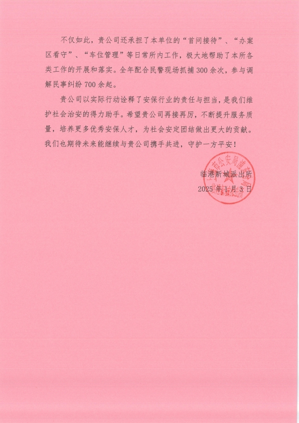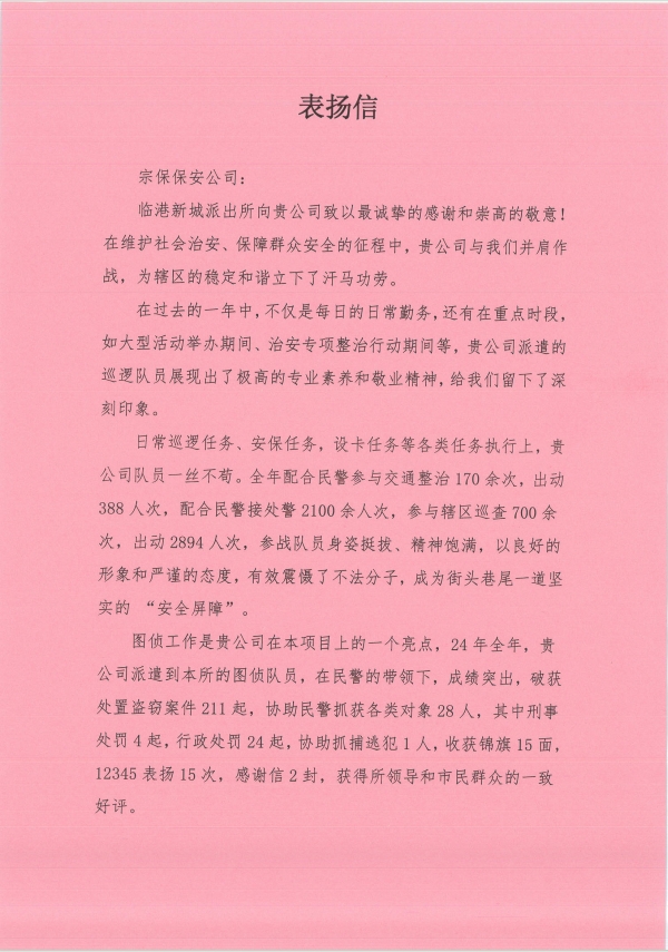 1宗保公司收到浦東新區(qū)公安分局臨港新城派出所3封表揚信