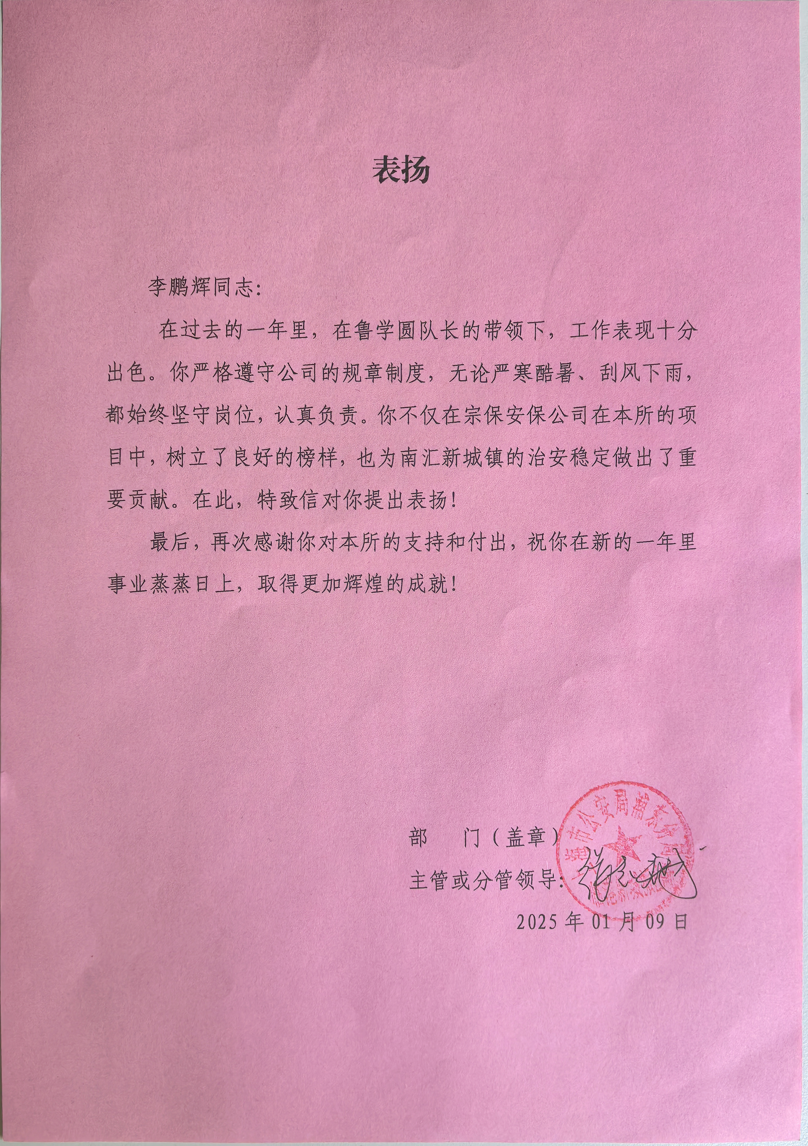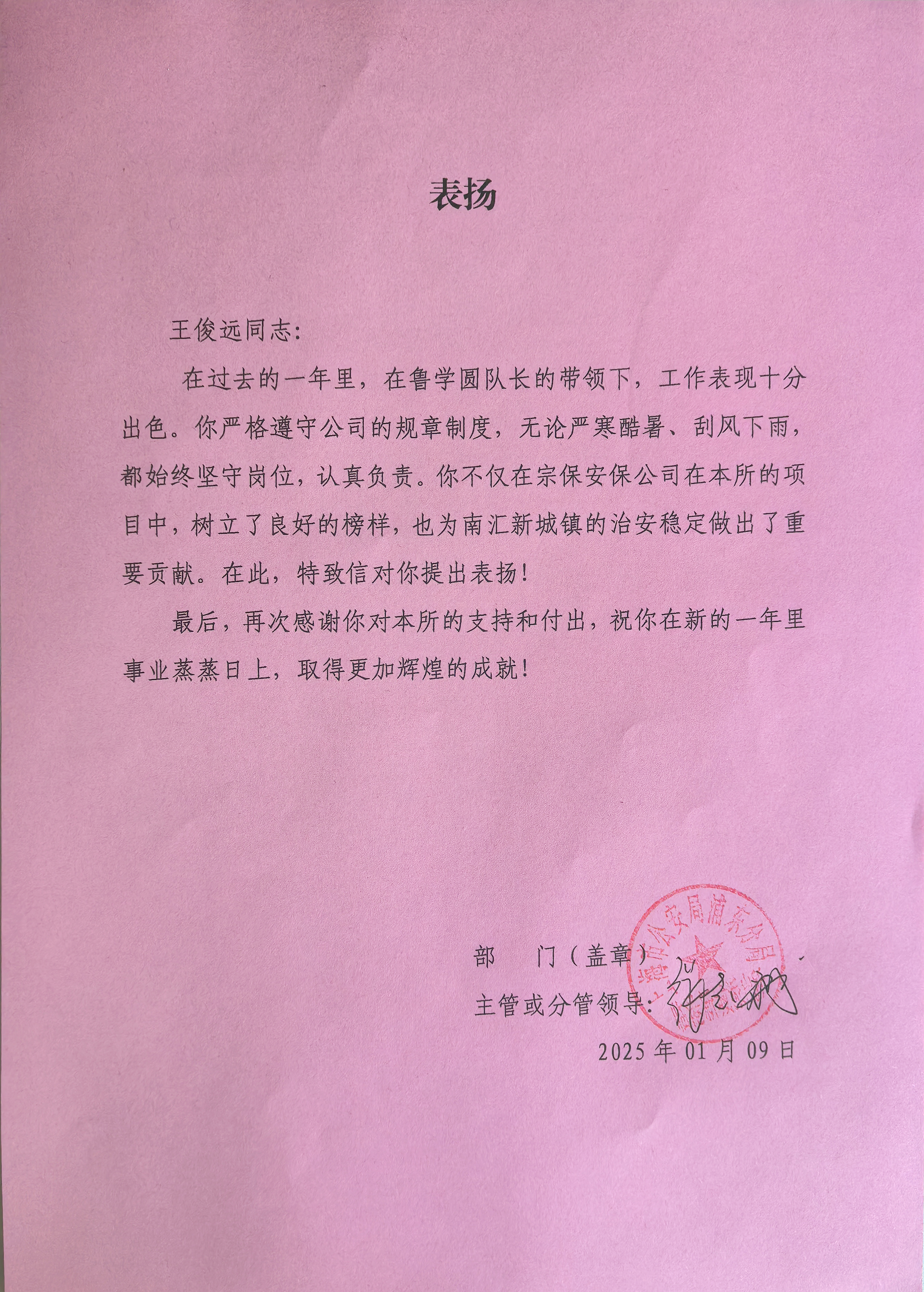 1月10日,宗保公司收到浦東新區(qū)公安分局臨港新城派出所3封表揚信,感謝公司對臨港新城派出所工作的大力支持和全力配合,贊揚公司員工李鵬輝和王俊遠(yuǎn)工作中認(rèn)真負(fù)責(zé)、嚴(yán)謹(jǐn)細(xì)致的突出表現(xiàn)。