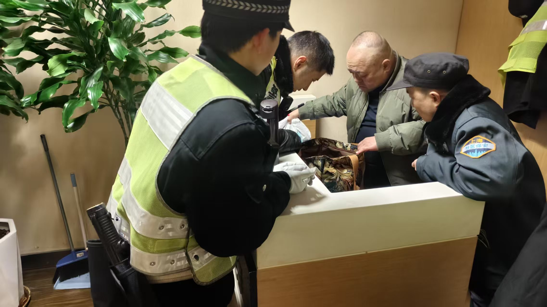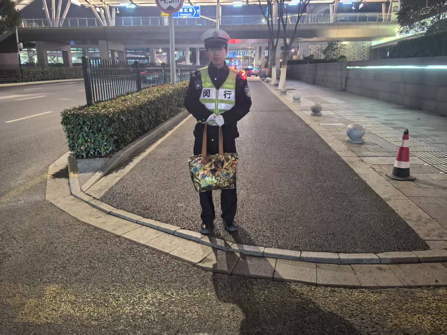 1月29日19:11,宗保公司駐閔行區(qū)交通委項目員工顧成昊在虹橋樞紐康德思酒店附近執(zhí)勤時,撿到一個裝有3張銀行卡、1張身份證、1個錢包以及若干衣物的挎包,報告項目隊長后便在原地等待。